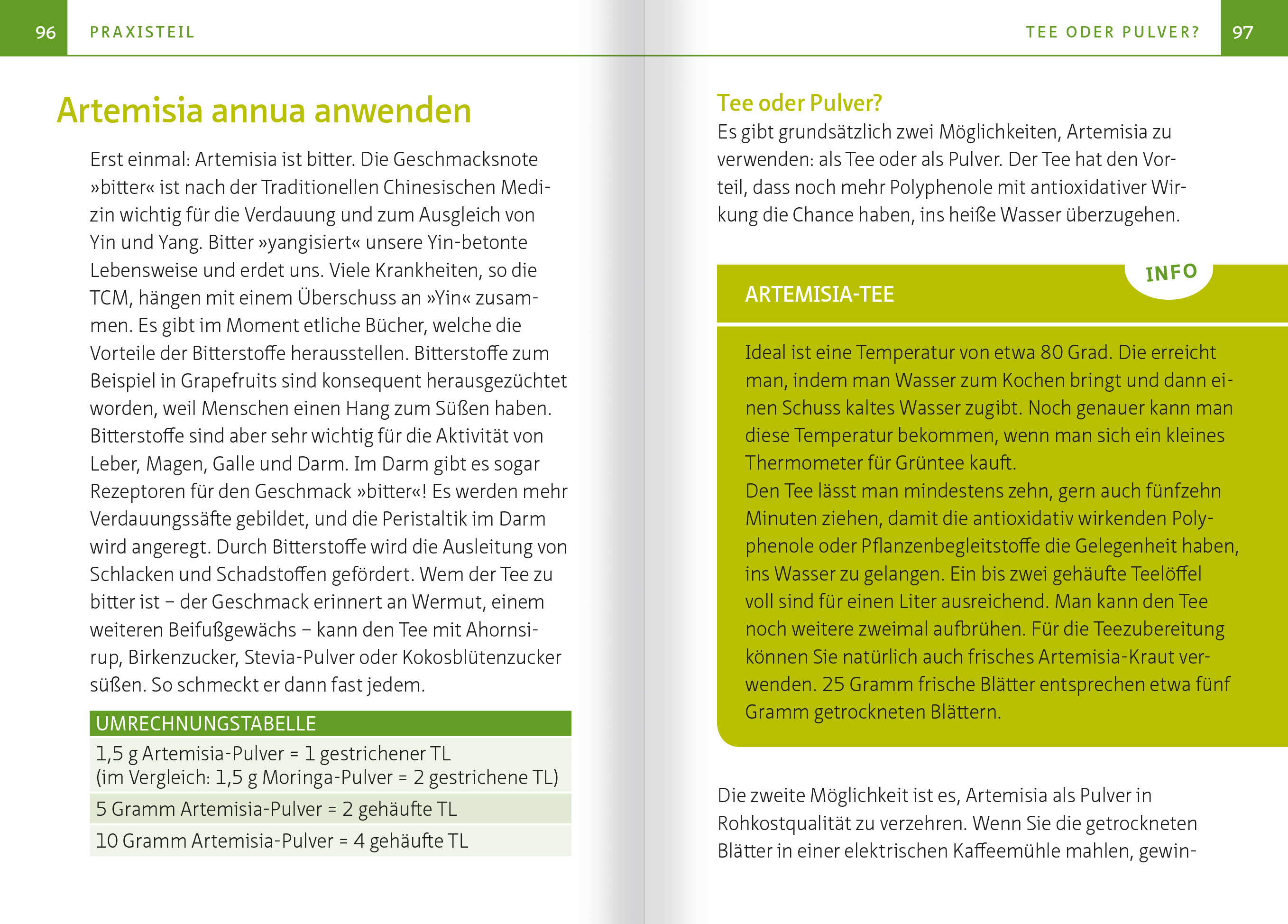 INHALTVorwortEinleitungARTEMISIA, EINE ERSTAUNLICHE PFLANZEHistorie und Botanik- Herkunft und Anbaugebiete- Daten zur Pflanze- Artemisia-Anbau zu Hause- Ernte und VerarbeitungInhaltsstoffe der Wunderpflanze- Mineralstoffe und Spurenelemente- Eiweiß- Vitamine- Ballaststoffe- Antioxidantien- Ätherische Öle- BitterstoffeARTEMISIA FÜR DIE GESUNDHEITArtemisia, ein Adaptogen- Die WirkweiseMalaria-Bekämpfung- Wirkstoff Artemisinin- Malaria - auch in Europa?- Aktiv vor Malaria schützenWobei hilft Artemisia?Anwendungsgebiete von A bis Z- AIDS/HIV- Alzheimer/Demenz- Arthritis- Asthma- Augenentzündungen- Azidose (Übersäuerung)- Bakterielle Infektionen- Blaseninfekte- Borreliose- Diabetes- Durchfall- Entzündungen- Epilepsie- Hämorrhoiden- Hautprobleme- Hoher Blutdruck- Immunsystem- Krebs- Magenprobleme- Malaria- Menstruationsbeschwerden- Morbus Parkinson- Pilzbefall- Tierbehandlung- Verdauungstrakt- Wasserreinigung- Würmer- WundenDiabetes, Borreliose und Krebs- Diabetes I in den Griff bekommen- Borreliose bekämpfen- Krebs die Stirn bietenPRAXISTEILArtemisia annua anwenden- Tee oder Pulver?- Dosis langsam steigern- Als Smoothie und KaffeeArtemisia-Salbe herstellenArtemisia-Rezepte- Borreliose- Candida-Befall im Mund- Husten- Krebsrezept von Anamed- ParasitenArtemisia - eine Perspektive?- Grün ernähren- Wahre Gesundheit und neue Gefahren- Lauernde Antibiotika- Unbekannte ErregerBezugsadressenQuellennachweise und LeseempfehlungenEndnotenRegister