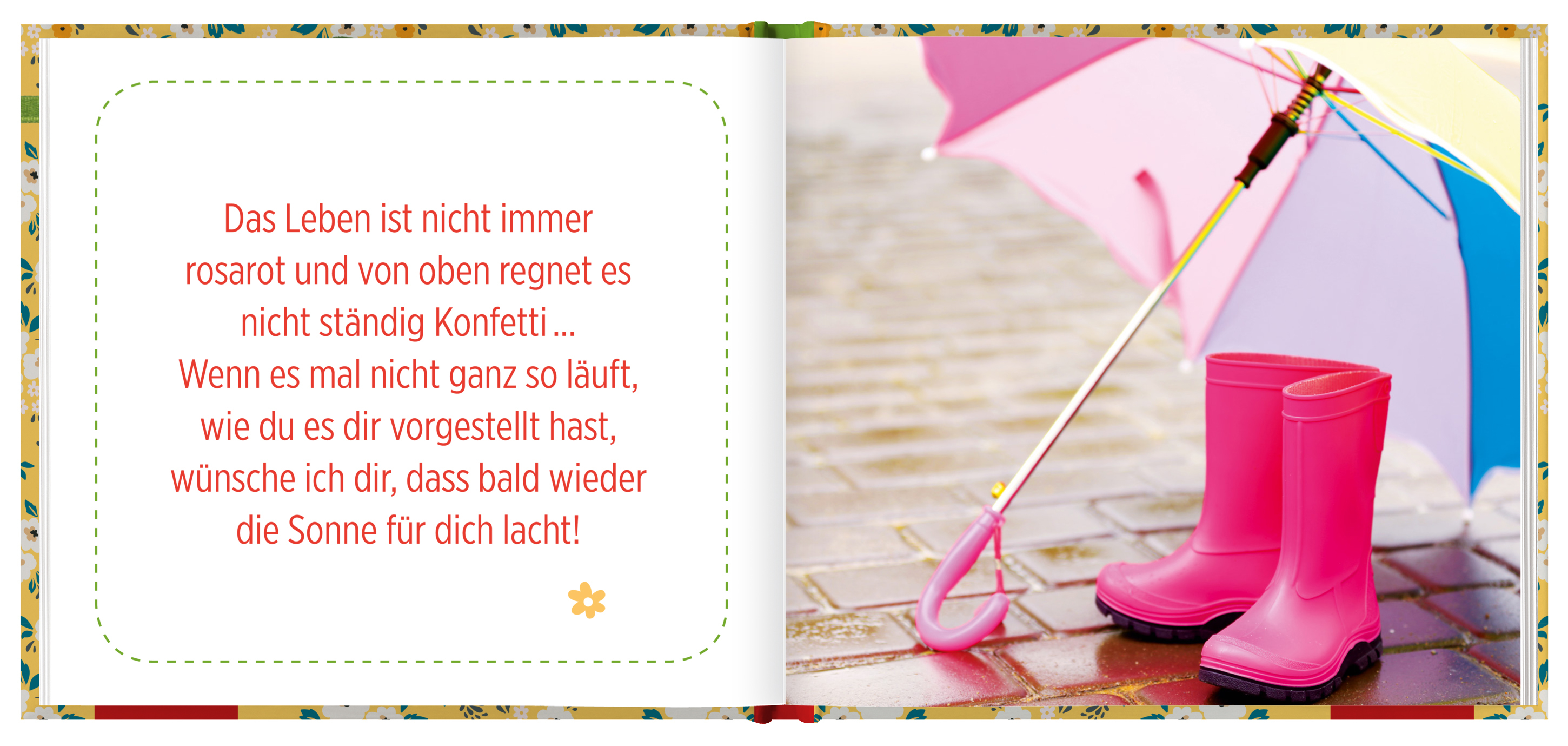 - Mit optimistischen Kurztexten und ermutigenden Worten, begleitet von passenden Fotografien und Blumen-Illustrationen