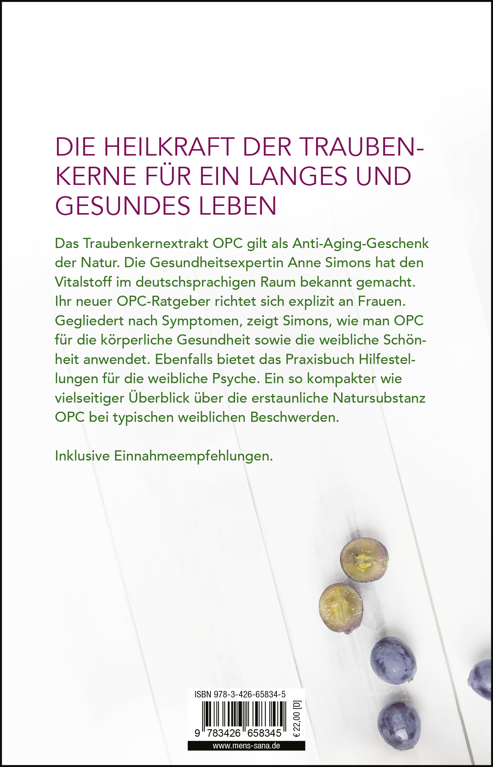 Anne Simons verband eine langjährige Freundschaft mit Prof. Masquelier. Sie hat den Vitalstoff OPC im deutschsprachigen Raum bekannt gemacht. Als ausgewiesene Expertin auf diesem Gebiet hält Anne Simons Vorträge über OPC. Sie hat bereits zwei OPC-Titel geschrieben, die Bestseller wurden. Die bekannte Gesundheitsexpertin präsentiert ein Gesundheitsbuch, das sich explizit mit der Wirkungsweise und Anwendung des Traubenkernextrakts OPC bei Frauen befasst.