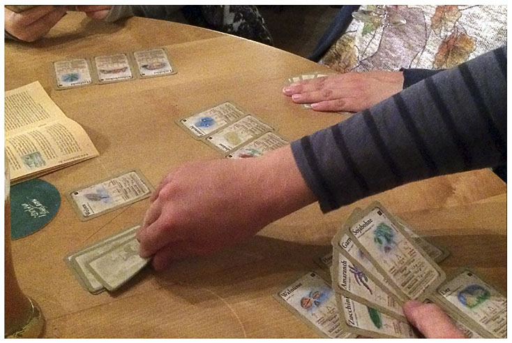 Braune Karten. Gewinner wird, wer am Ende die beste Aminosäureverkettung hat.