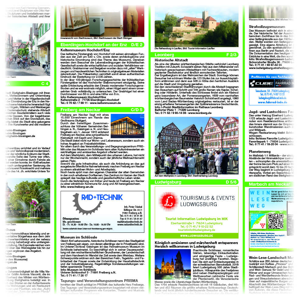 Die Gegend rund um Ludwigsburg zeichnen zahlreiche Rad- und Wanderwege als ideales Gebiet für sportliche Touristen aus. Entlang von Neckar, Murr und Enz führen die Wege durch Obst- und Weinanbaugebiete. Andere Strecken lassen die Naturparks Stromberg-Beuchelheim und Schwäbisch Fränkischer Wald erkunden. Ludwigsburg und Stuttgart laden zu Besichtigungen ein. Infos hierzu und zu weiteren Orten gibt es auf der Rückseite.