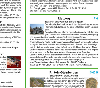 Die Region um den Teutoburger Wald hat vieles zu bieten: Erholsame Angebote wie Thermen oder Landschaftsparks befinden sich in den zahlreichen Badestädten der Gegend. Als eher naturbezogene Attraktionen können die besteigbaren Externsteine oder auch die Dörenther Klippen in Ibbenbüren gelten. Kulturell Interessierte kommen auch auf ihre Kosten: So warten Museen in Bielefeld, Osnabrück und Paderborn auf Besucher. Aktuelle Infos finden sich im Erlebnisführer, der Kartenteil bietet entsprechende Orientierung.