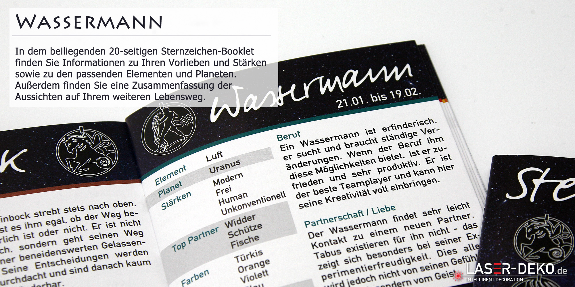 Sternzeichenwürfel 'WASSERMANN' Sternzeichen (Tierkreiszeichen) bezeichnen die 12 Abschnitte des Tierkreises, die das Jahr in zwölf Abschnitte unterteilen. Der Abschnitt, in dem das Geburtsdatum liegt, steht für ganz bestimmte Eigenschaften, Stärken und Vorlieben. Wer dies weiß, kann hieraus für sich Kraft schöpfen und Entscheidungen besser abwägen. Ein 20-seitiges Booklet informiert über die persönlichen Vorlieben, Stärken und Lebenswege. Neben dem Booklet enthält der Sternzeichenwürfel einen edlen Anhänger aus Walnussholz mit einem Lederband. Die grafisch elegante Umsetzung, der perfekte Laserschnitt und das hochwertige Material machen diesen Anhänger zu einem ganz besonderen Schmuckstück. Lassen Sie sich von den Sternen in Ihrem Lebensweg unterstützen!