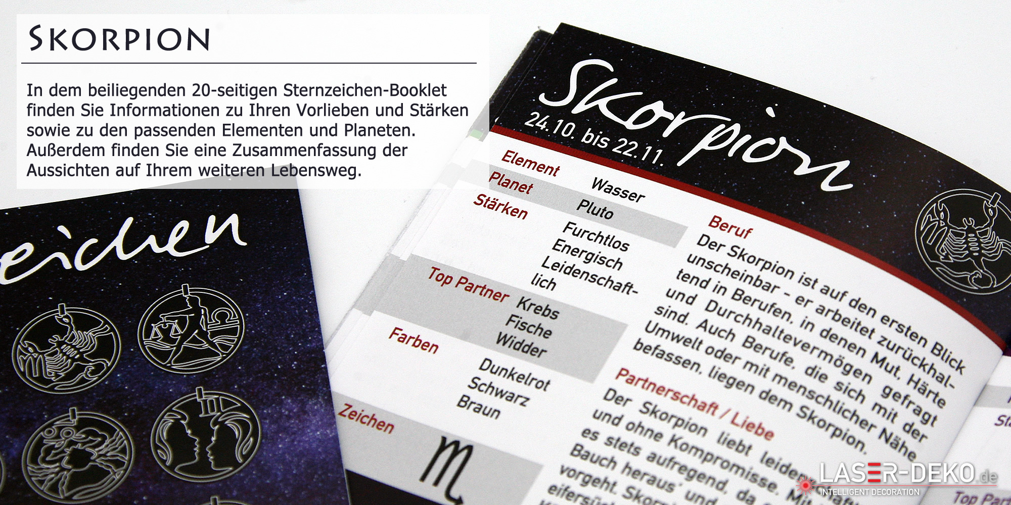 Sternzeichenwürfel 'SKORPION' Sternzeichen (Tierkreiszeichen) bezeichnen die 12 Abschnitte des Tierkreises, die das Jahr in zwölf Abschnitte unterteilen. Der Abschnitt, in dem das Geburtsdatum liegt, steht für ganz bestimmte Eigenschaften, Stärken und Vorlieben. Wer dies weiß, kann hieraus für sich Kraft schöpfen und Entscheidungen besser abwägen. Ein 20-seitiges Booklet informiert über die persönlichen Vorlieben, Stärken und Lebenswege. Neben dem Booklet enthält der Sternzeichenwürfel einen edlen Anhänger aus Walnussholz mit einem Lederband. Die grafisch elegante Umsetzung, der perfekte Laserschnitt und das hochwertige Material machen diesen Anhänger zu einem ganz besonderen Schmuckstück. Lassen Sie sich von den Sternen in Ihrem Lebensweg unterstützen!