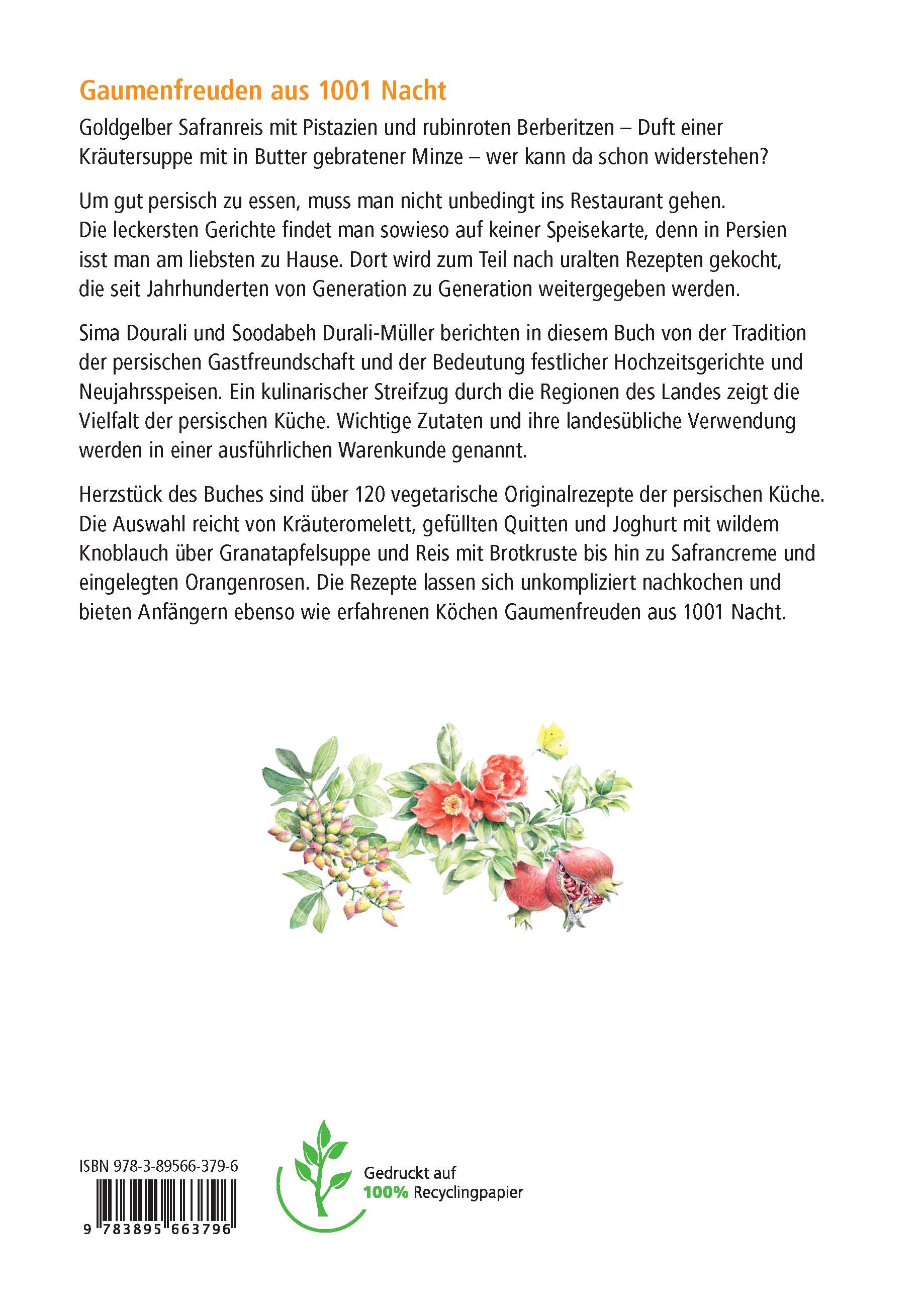 Sima Dourali und Soodabeh Durali-Müller erzählen in ihrem Buch von der Tradition der persischen Gastfreundschaft und der Bedeutung festlicher Hochzeitsgerichte und Neujahrspeisen. Ein kulinarischer Streifzug durch die Regionen des Landes zeigt die Vielfalt der persischen Küche. Wichtige Zutaten und ihre landesübliche Verwendung werden in einer ausführlichen Warenkunde genannt.