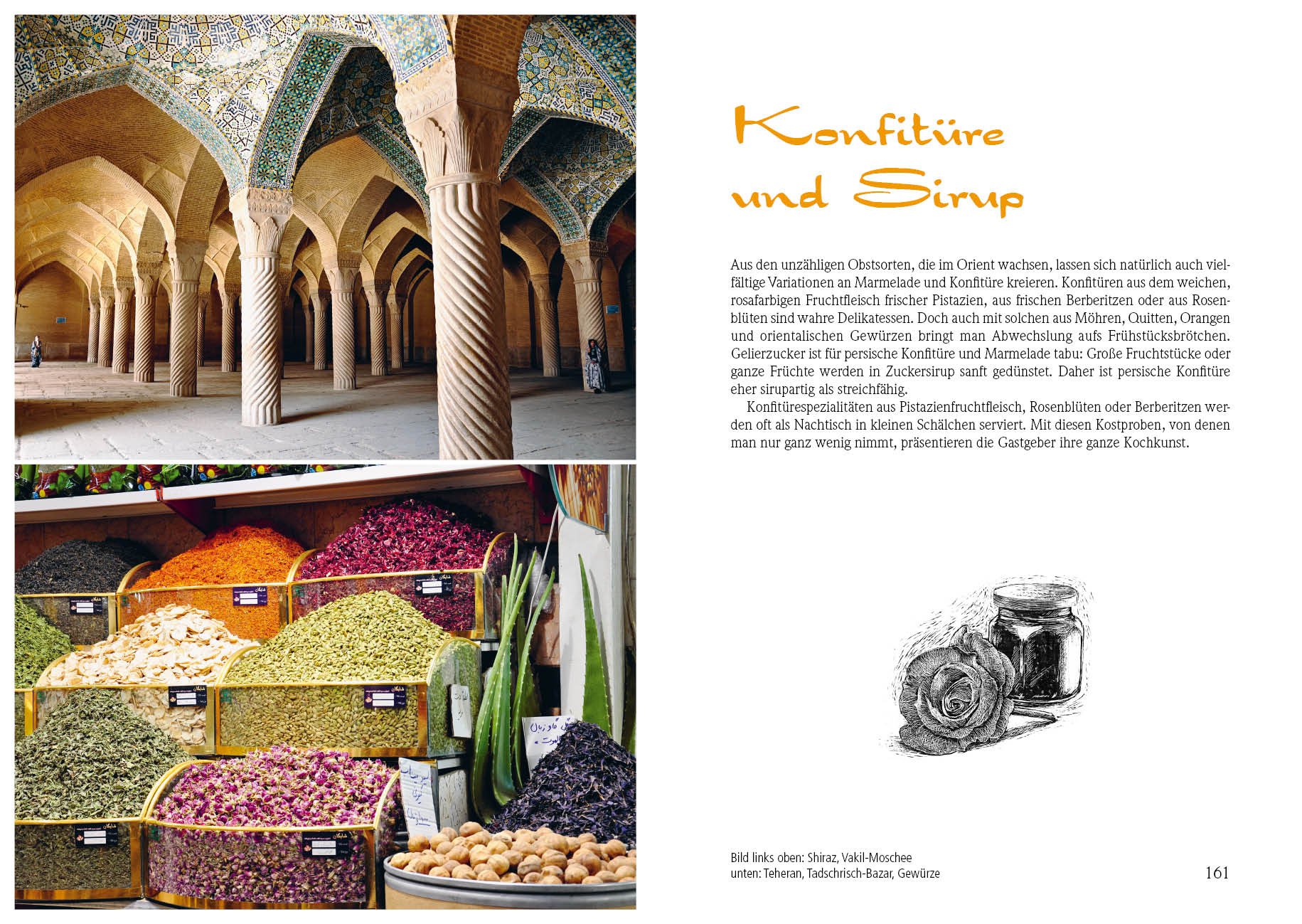 Herzstück des Buches sind über 120 vegetarische Originalrezepte der persischen Küche. Die Auswahl reicht von Kräuteromelett, gefüllten Quitten und Joghurt mit wildem Knoblauch über Granatapfelsuppe und Reis mit Brotkruste bis hin zu Safrancreme und eingelegten Orangenrosen. Die Rezepte lassen sich unkompliziert nachkochen und bieten Anfängern ebenso wie erfahrenen Köchen Gaumenfreuden aus 1001 Nacht.