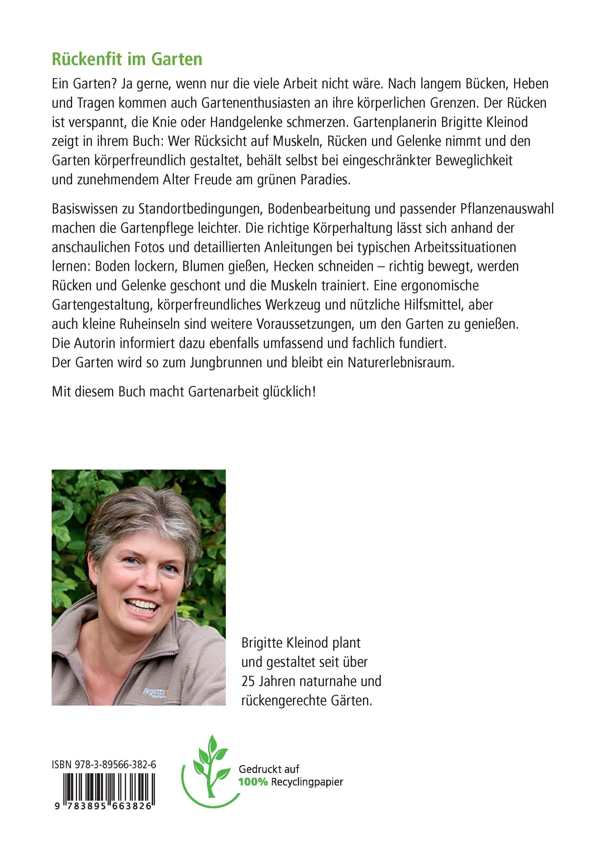 Ein Garten? Ja gerne, wenn nur die viele Arbeit nicht wäre. Nach langem Bücken, Heben und Tragen kommen junge wie ältere Gartenbesitzer an ihre körperlichen Grenzen. Der Rücken ist verspannt, die Knie oder Handgelenke schmerzen. Die Gartenplanerin Brigitte Kleinod zeigt in ihrem Buch: Wer Rücksicht auf Muskeln, Rücken und Gelenke nimmt und den Garten körperfreundlich gestaltet, behält selbst bei eingeschränkter Beweglichkeit und zunehmendem Alter Freude am grünen Paradies.
