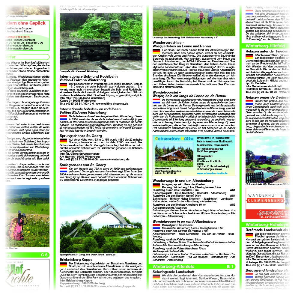 Winterberg im Sauerland ist ein beliebtes Ausflugsziel nicht nur für das Ruhrgebiet, sondern auch grenzübergreifend für unsere niederländischen Nachbarn. Aus diesem Grunde ist die Karte zweisprachig angelegt. Rund um die Winterberger Schanze, die Ruhrquelle, Altastenberg, Kahler Asten und Züschen eröffnet sich ein wahres Wanderparadies mit zahlreichen Qualitätswegen wie dem Rothaarsteig©, Sauerland Höhenflug und Uplandsteig. Immer neue herrliche Aus- und Fernsichten sorgen für eine wahre Flut an neuen Eindrücken und Erholung vom Alltag.