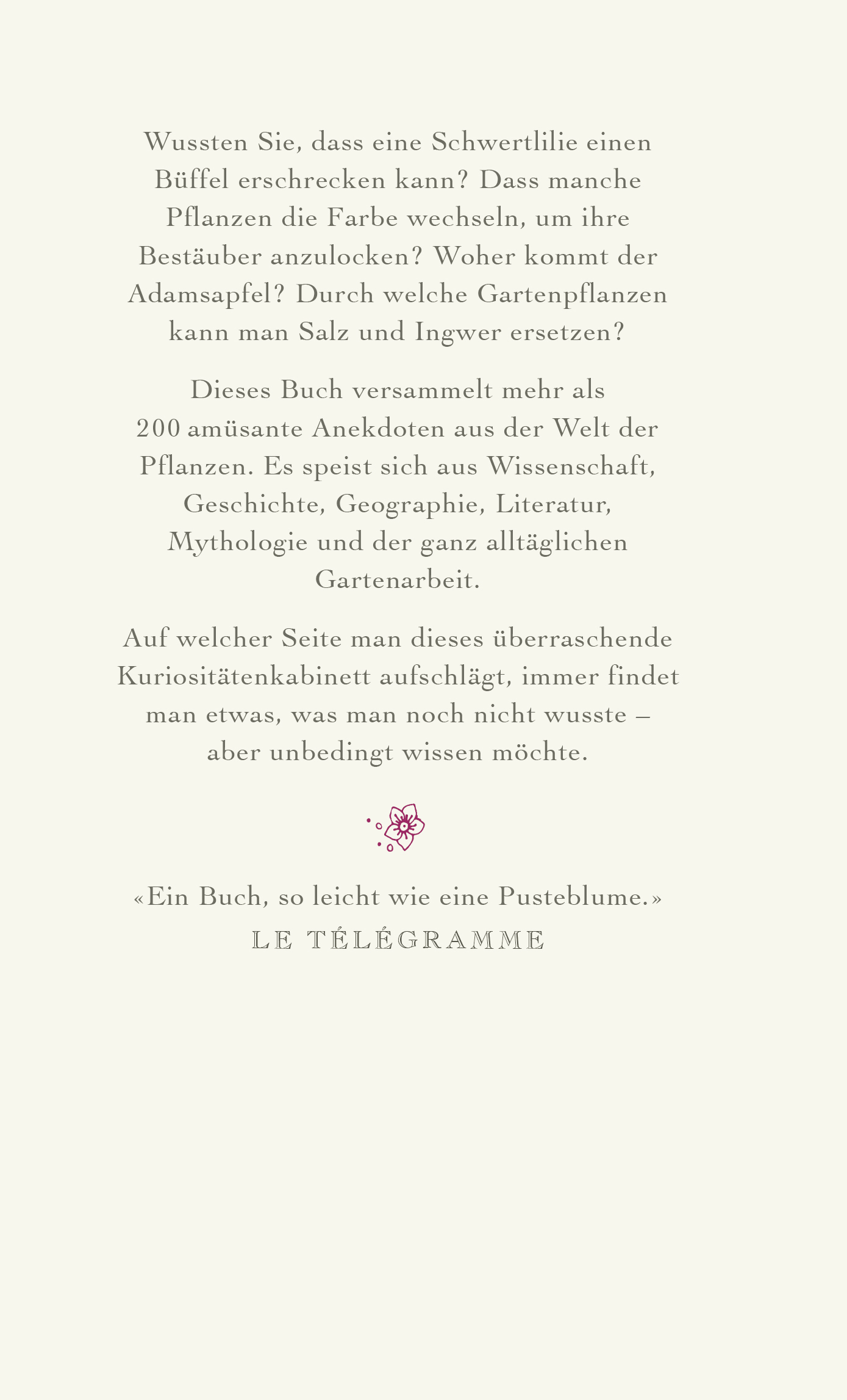 Dieses Buch versammelt mehr als 200 amüsante Anekdoten aus der Welt der Pflanzen. Es speist sich aus Wissenschaft, Geschichte, Geographie, Literatur, Mythologie und der ganz alltäglichen Gartenarbeit.