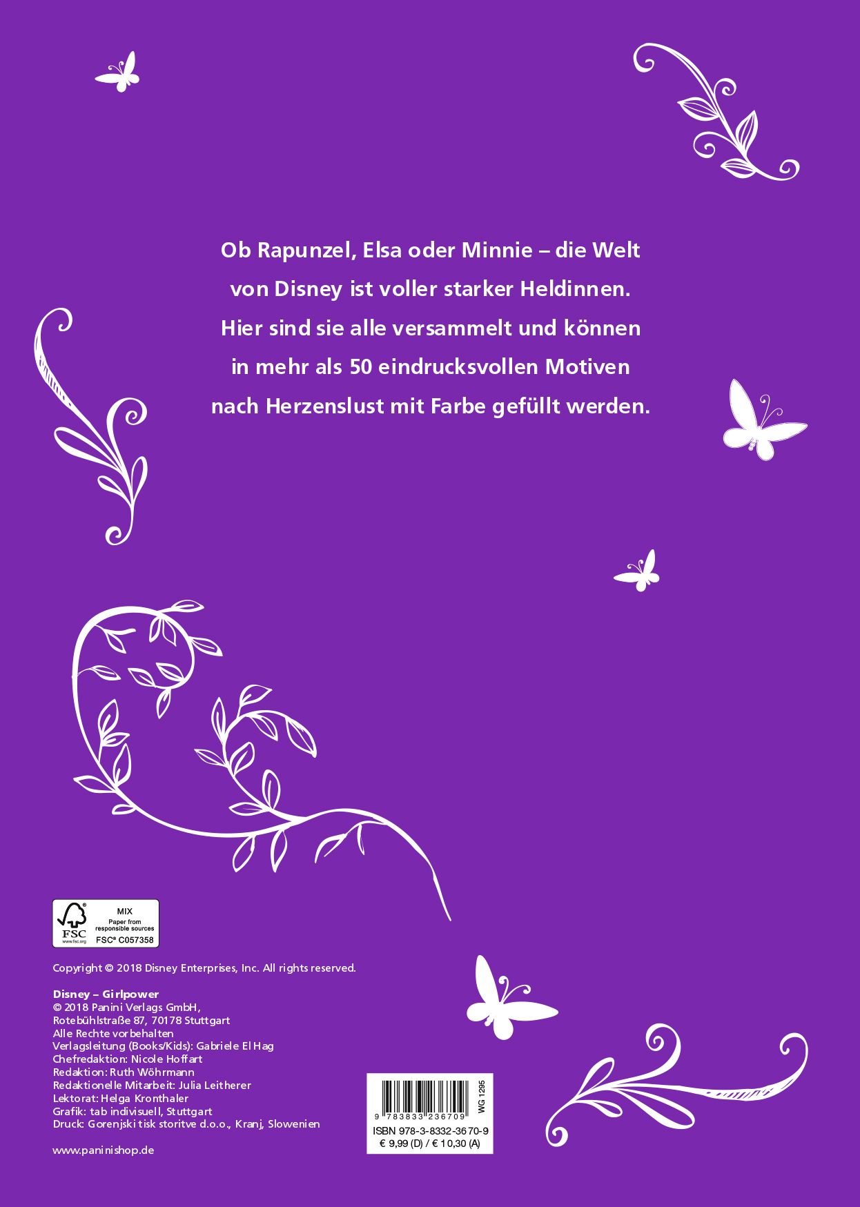 Ob Rapunzel, Elsa oder Minnie - die Welt von Disney ist voller starker Heldinnen. Hier sind sie alle versammelt und können in mehr als 50 eindrucksvollen Motiven nach Herzenslust mit Farbe gefüllt werden.