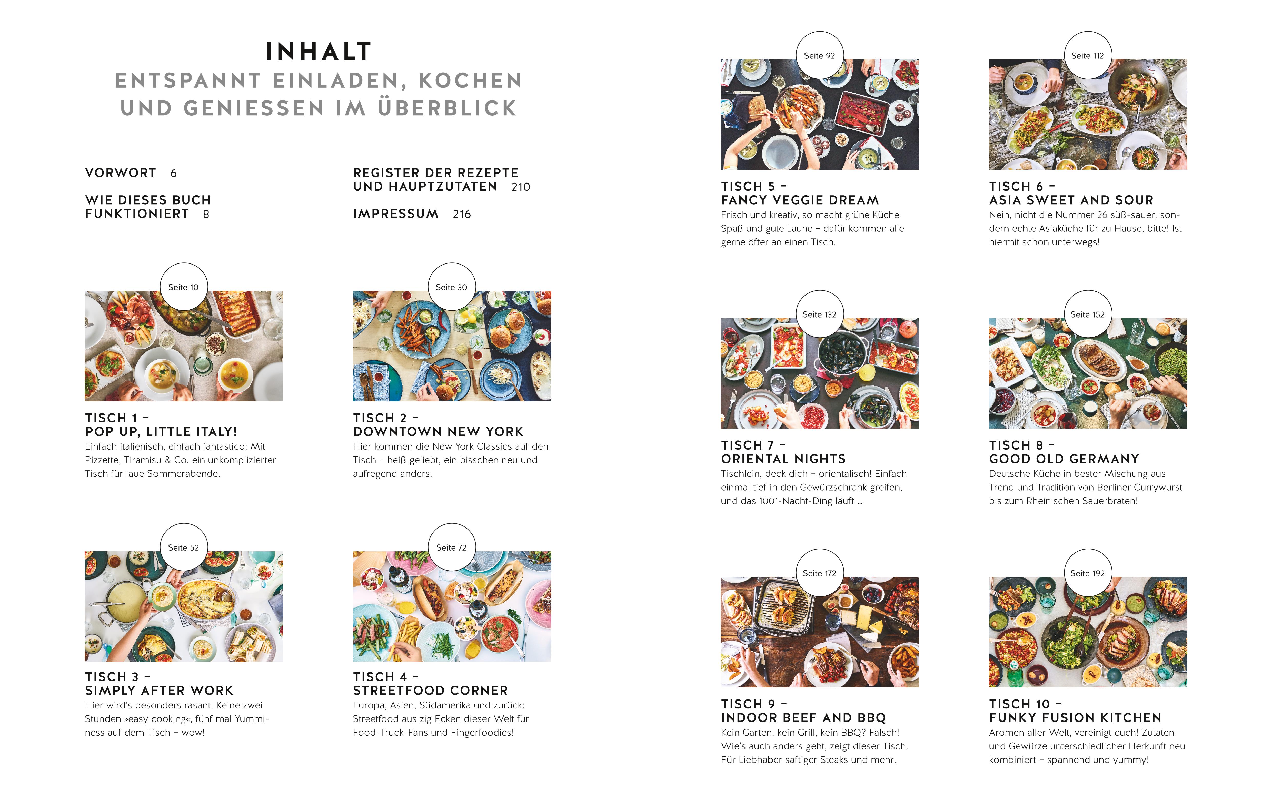 "Ich will Freunde zum Essen zusammenbringen, das ist mein großes Ziel", sagt Supperclub-Profi Sebastian Hoffmann. Und hat dafür die perfekte Lösung parat: Fünf bis sechs Gerichte kommen gleichzeitig auf den Tisch. Jeder pickt mal hier, mal da, der Schmorbraten steht neben dem Tiramisu und den Antipasti - und der Gastgeber feiert und genießt von Anfang an mit. Alle an einen Tisch ... und alles auf einen Tisch bietet dabei für jeden Anlass ein Thema, vom After-Work-Dinner bis hin zum German-Soulfood-Abend, mit je fünf bis sechs Gerichten für sechs Personen. Die Organisation gibt das Buch vor: Rezepte, Einkaufs- und Getränkeliste, Zeitplan fürs Kochen und Finish, Tischdeko - hier wurde nichts vergessen. Und ist so übersichtlich strukturiert, dass jeder sofort weiß, was zu tun ist. Ob der Gastgeber alleine kocht, jeder ein Gericht mitbringt oder alle zusammen in der Küche stehen - klappt locker vom Hocker dank perfekter Planung! So entspannt ist einladen heute: alle an einem Tisch und alles auf einem Tisch!