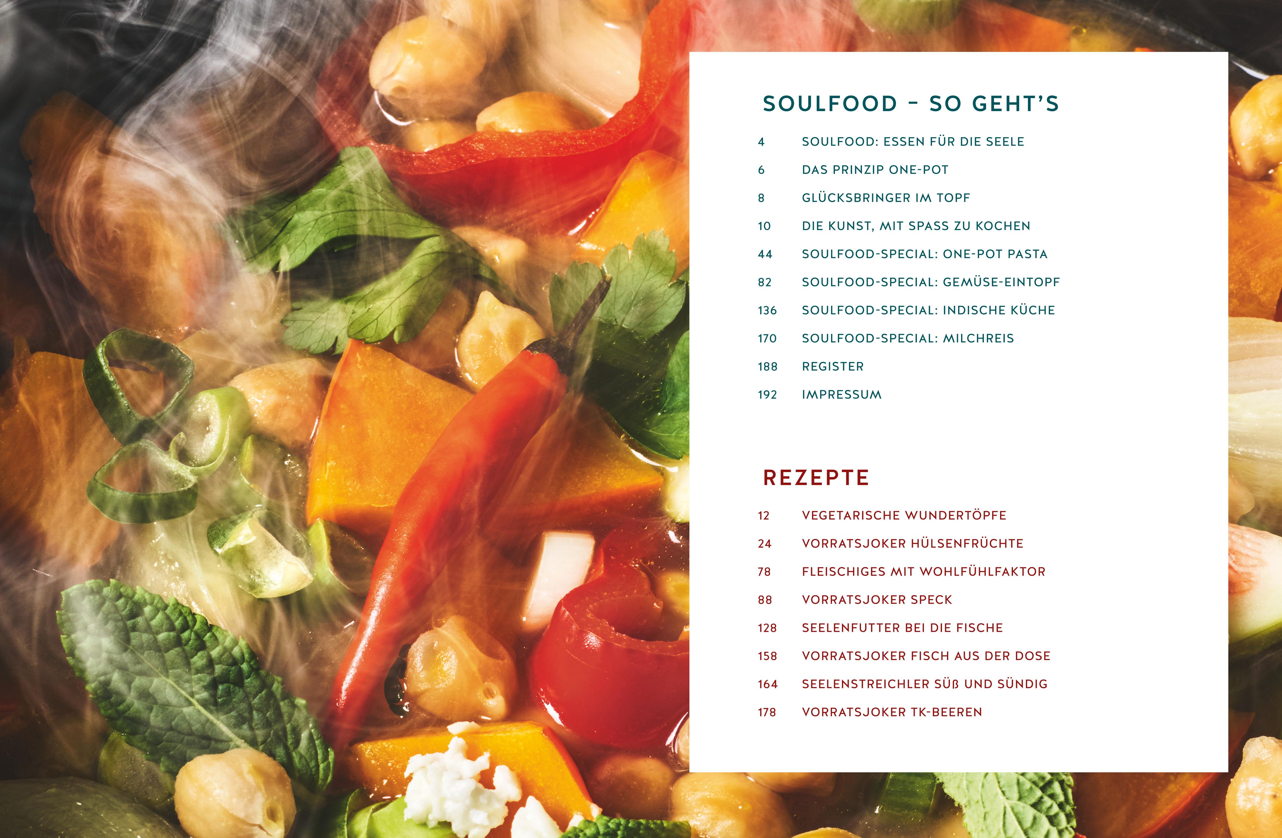 Hinweis zur OptimierungImpressumSoulfood: Essen für die SeeleDas Prinzip One-PotGlücksbringer im TopfDie Kunst, mit Spaß zu kochenVegetarische WundertöpfeFleischiges mit WohlfühlfaktorSeelenfutter bei die FischeSeelenstreichler süß und sündigDie AutorinnenDie Fotografin