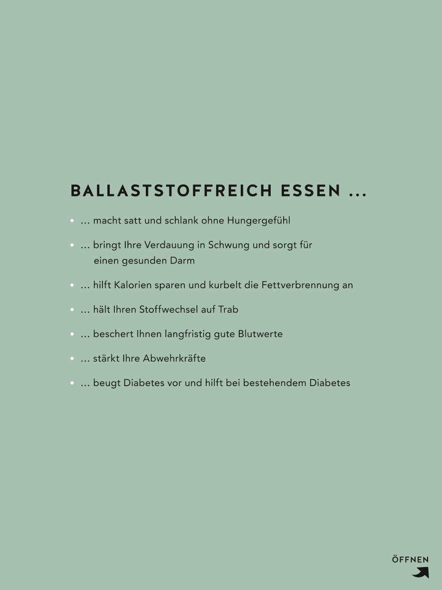 Wie gesund Ballaststoffe sind, wird immer mehr erkannt. Sie regulieren die Darmtätigkeit und beeinflussen den Stoffwechsel positiv. Durch ihre sättigende Wirkung und das Quellvermögen helfen sie erfolgreich gegen Übergewicht und einen trägen Darm. Ballaststoffe kommen auch vorbeugend gegen Bluthochdruck, Fettstoffwechselstörungen, Diabetes Typ 2 und Dickdarmkrebs zum Einsatz. Als Tagesbedarf werden mindestens 30 g empfohlen. Gute Quellen ausfindig zu machen, ist aber nicht so einfach. Der Ratgeber bietet dafür eine wertvolle Hilfe. Ein Test hilft zu erkennen, wie ballaststoffreich die momentane Ernährung ist. Wie es in drei Phasen gelingt, den Anteil zu erhöhen, zeigt der umfangreiche Praxisteil. Ausführliche Tabellen bieten einen optimalen Überblick zum Ballaststoffgehalt von unverarbeiteten Lebensmitteln, beliebten Fertigprodukten und zubereiteten Speisen. Rund 40 Satt- und Schlankrezepte sowie Tagespläne und Ideen fürs Tauschen von Zutaten machen die Umsetzung wirklich leicht.