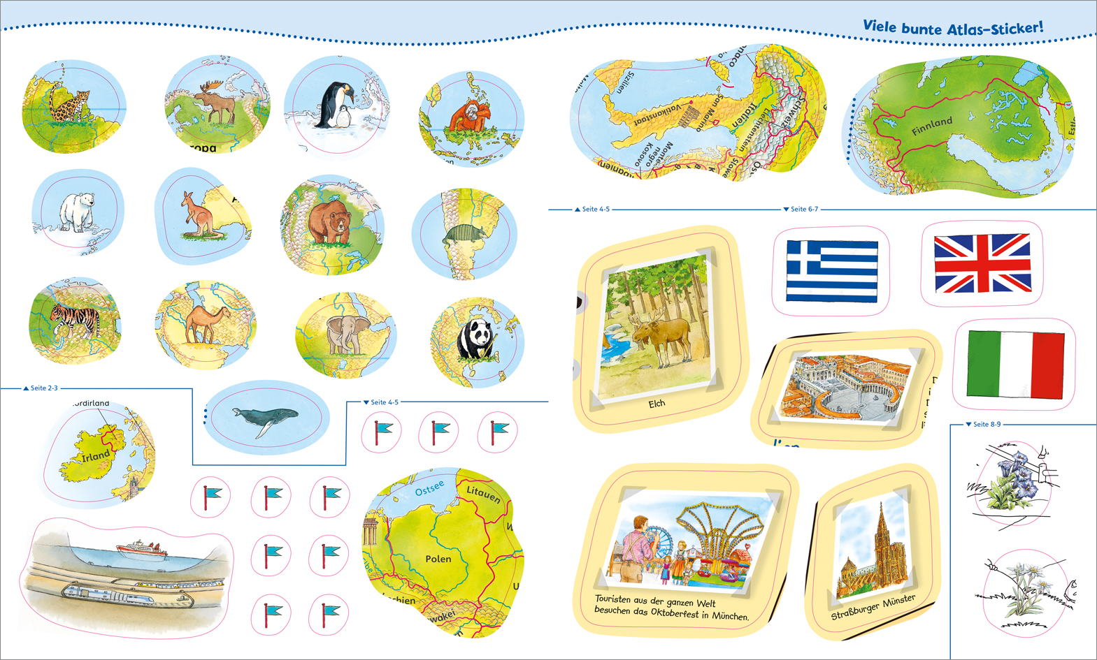 | Schlagworte | Alpen • Amerika • Antarktis • Äquator • Arktis • Asien • Ausmalen • Australien • Deutschland • Europa • Frankreich • Italien • Klima • Kontinent • Länder • Malen • Mittelmeer • Ozean • Rätsel • Regenwald • Reise • Sticker • Tiere • Welt • Wüsten |