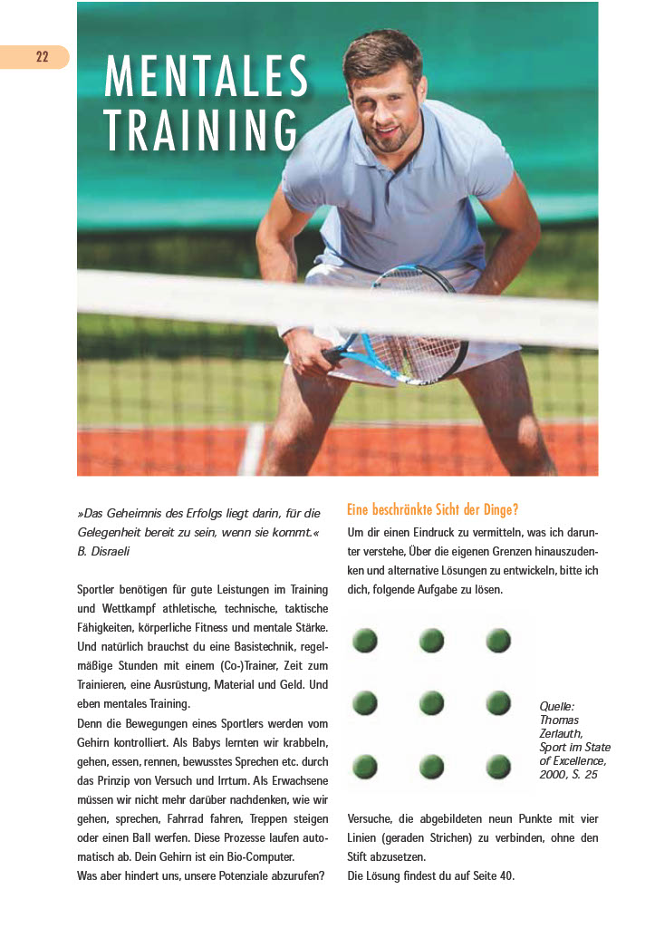 | Schlagworte | Aktivierung • Aufmerksamkeitslenkung • Coaching • Emotionen • Entspannung • Erfolg • Konzentration • Konzentrationstraining • Körpersprache • Leistungssport • Mentalcoaching • Mentaltraining • Motivation • NLP • Oliver Kahn • Positives Denken • Rituale • Selbstbewusstsein • Sport • Sportmentaltraining • Stressbewältigung • Training • Visualisierung • Vorstellungstraining • Wettkampf • Wettkampfvorbereitung • Ziele setzen |