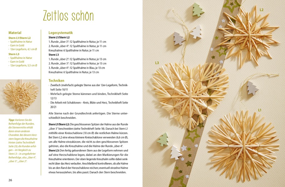 Strohsterne nostalgisch schön Diese Klassiker unter den Weihnachtsdekorationen schmücken Tannenbaum, Fenster, Tisch und Strauß und strahlen mit ihren symmetrischen Formen und warmen Farben Ruhe und Behaglichkeit aus. Mit den praktischen Legeformen, die es im Hobbyfachhandel gibt, sind sie leicht gemacht: Einfach die Strohhalme einlegen, mit dem Klemmring fixieren und mit einem Faden abbinden. Im beigelegten Technikheft wird mit Arbeitsschrittfotos und einer Legetabelle ganz genau gezeigt, wie's geht. Für eine wunderschöne Weihnachtszeit!