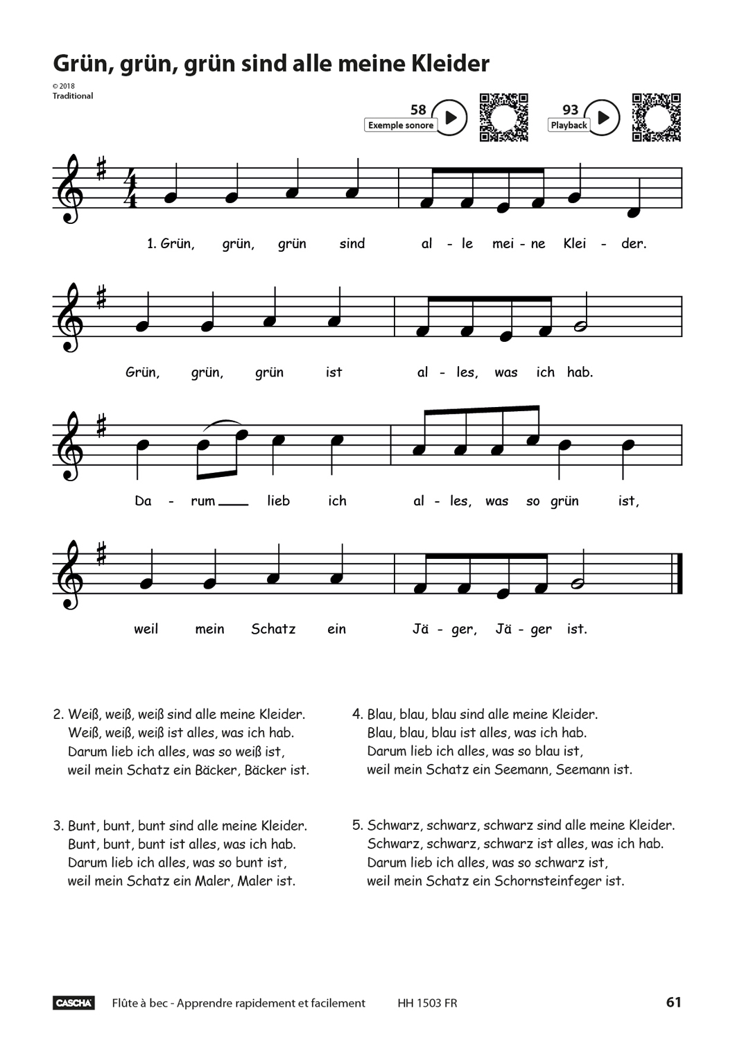 Pour de nombreuses chansons, il existe une excellente playback en deux versions - avec flûte à bec comme exemple sonore et comme playback à jouer avec. Vous pouvez ainsi écouter tout ce qui se trouve sur le CD ou via les codes QR et jouer ensuite avec l‘accompagnement. Cela garantit un sentiment d‘accomplissement et rend le jeu amusant dès la première note.