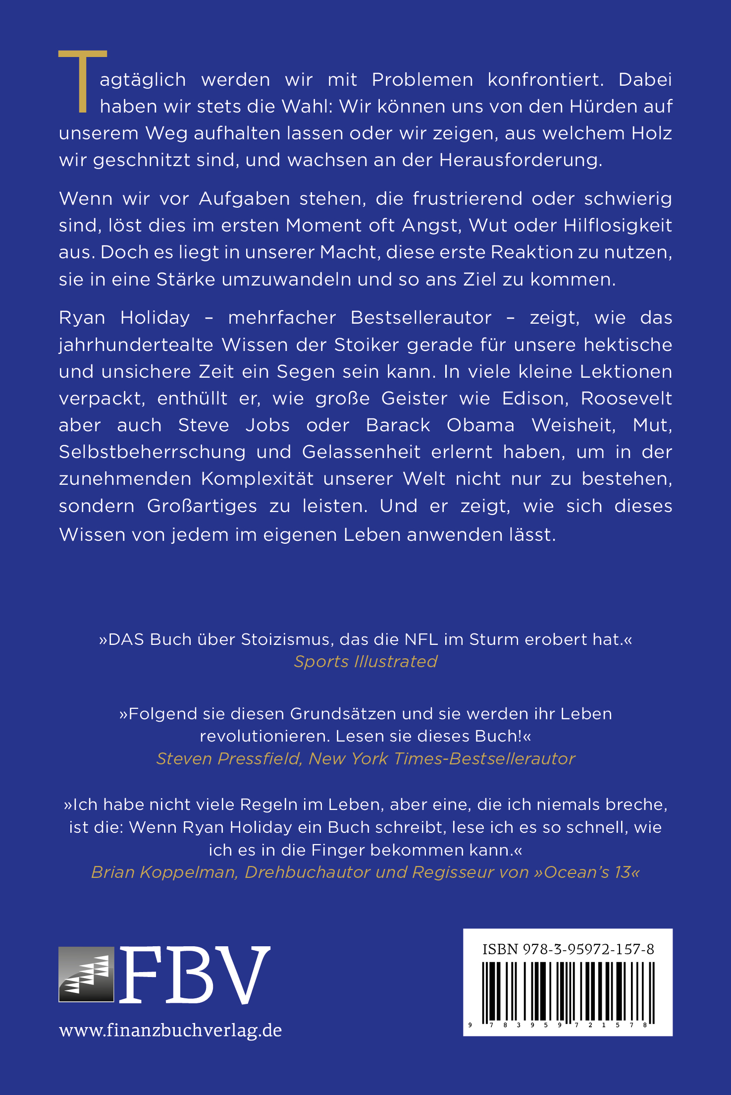 Ryan Holiday - mehrfacher Bestsellerautor - zeigt, wie das jahrhundertealte Wissen der Stoiker gerade für unsere hektische und unsichere Zeit ein Segen sein kann. In viele kleine Lektionen verpackt, enthüllt er, wie große Geister wie Edison, Roosevelt aber auch Steve Jobs oder Barack Obama Weisheit, Mut, Selbstbeherrschung und Gelassenheit erlernt haben, um in der zunehmenden Komplexität unserer Welt nicht nur zu bestehen, sondern Großartiges zu leisten. Und er zeigt, wie sich dieses Wissen von jedem im eigenen Leben anwenden lässt.