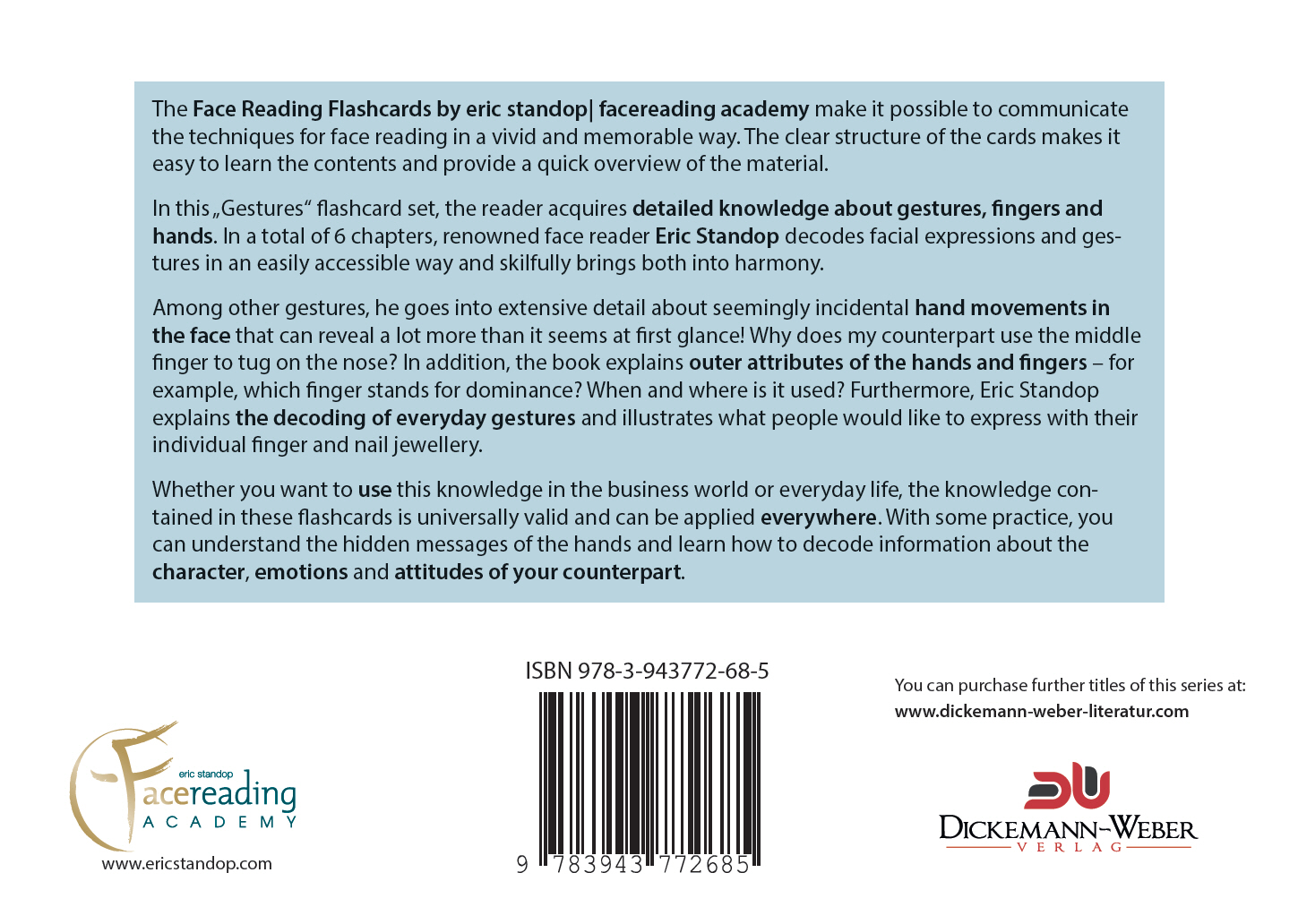 Die Lernkarten Gesichtlesen der eric standop| facereading academy vermitteln Gesichtlesetechniken durch ihren übersichtlichen Aufbau leicht erlernbar und gleichzeitig spannend. Die Karten sind strukturiert aufgebaut und fördern dadurch das Behalten des Stoffes.
