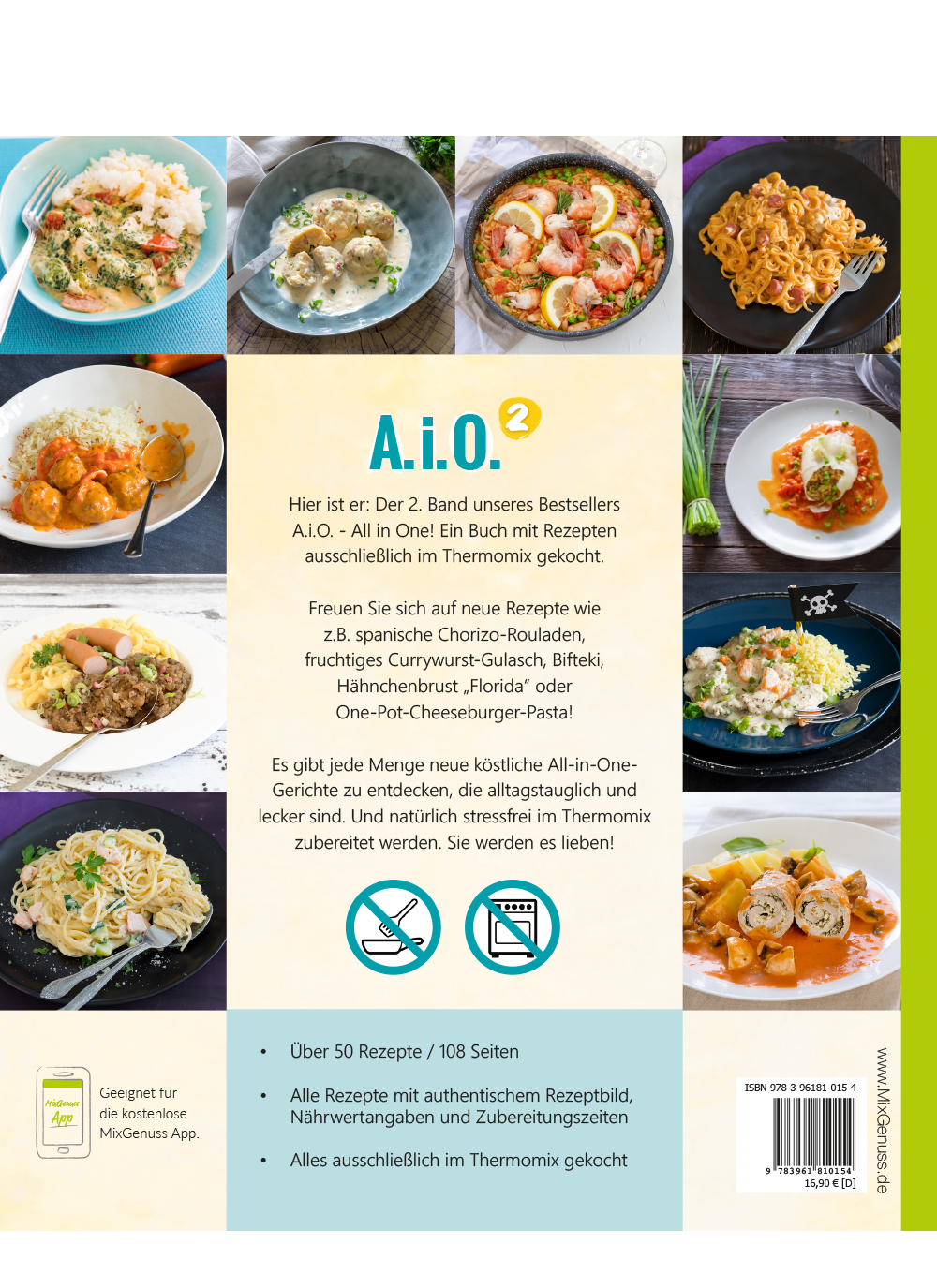 Hier ist er: Der 2. Band unseres Bestsellers A.i.O. - All in One! Ein Buch mit Rezepten ausschließlich im Thermomix gekocht.Freuen Sie sich auf neue Rezepte wie z.B. Spinat-Kokos-Hähnchen, deftiges Currywurst-Gulasch, Rouladen mit Senf-Meerrettich-Soße oder z.B. die One-Pot-Cheeseburger-Pasta! Es gibt jede Menge neue Gerichte zu entdecken, die wie immer alltagstauglich, lecker und natürlich stressfrei im Thermomix zubereitet werden. Sie werden es lieben!