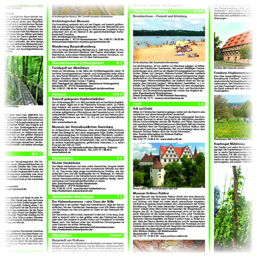 Das Zentrum der Karte bildet das Fränkische Seenland mit dem Altmühlsee, dem Großen Brombachsee sowie dem Rothsee. Ufernah führen Fernradwege um die Seen, die mit Freizeitangeboten locken. 15 Fernradwege und 4 Fernwanderwege zeichnen die Region rund um den Naturpark Altmühltal als ideales Gebiet für Aktivurlauber aus. Erwähnenswert: ein interaktiver Storchenradwanderweg und der Limes Rad- und Wanderweg mit Überresten der historischen Grenze. Ausflugstipps sind im Infoteil zusammengetragen.
