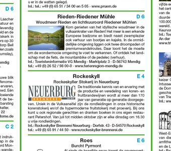 Evenementengids Eifel (Nederlands). De mooiste plekjes Niederländische Ausgabe des Erlebnisführers Eifel Die Eifel bietet als Mittelgebirge nicht nur Wanderfreunden erlebnisreiche Aufenthalte. Die Menge der Markierungen im Kartenteil zeigt: Hier ist für jeden etwas Interessantes dabei! Sei es der bekannte Nürburgring oder die Angebote zur geologischen Geschichte der Vulkaneifel rund um Manderscheid und Daun. Nicht zu vergessen: die Mosel mit ihren schönen Weinorten am Ostrand des Mittelgebirges. Nähere Infos zu allen Angeboten findet man auf der Kartenrückseite.