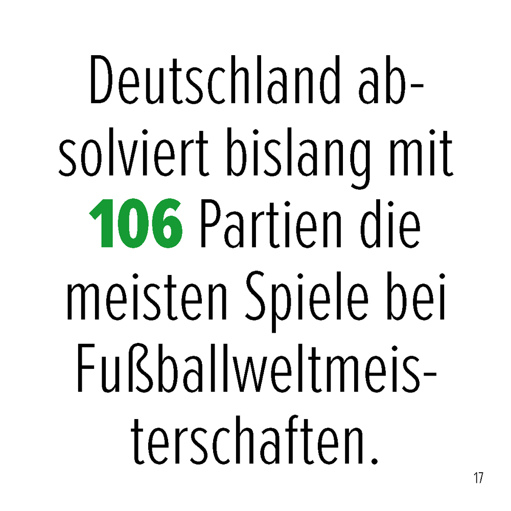 - Frankreich gegen Mexiko, das erste Spiel einer Fußballweltmeisterschaft, wird am 13. Juli 1930 in Montevideo/Uruguay von 4444 Zuschauern verfolgt.- Zwischen 1990 und 2002 steht der italienische Nationalspieler Paolo Maldini 2217 Minuten auf dem Platz - WM-Rekord.- Der erste wegen Dopings ausgeschlossene Spieler ist der Haitianer Ernest Jean Joseph, der bei der Fußballweltmeisterschaft 1974 positiv auf das Asthmamittel Ephedrin getestet wird.- Mit 19 Partien ist das Aztekenstadion in Mexiko-Stadt häufigster Austragungsort von WM-Spielen.- Der serbische Trainer Bora Milutinovic bringt das Kunststück fertig, an 5 aufeinanderfolgenden Turnieren mit 5 verschiedenen Teams teilzunehmen: Mexiko (1986), Costa Rica (1990), USA (1994), Nigeria (1998) und China (2002)."100 x - Fußball-WM in Zahlen" ist ein Sportbuch der etwas anderen Art. Lernen Sie das bedeutendste Fußballturnier auf diesem Planeten anhand von Zahlen kennen!