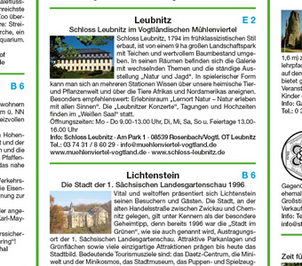 Das Vogtland, zwischen Sachsen, Thüringen, Bayern und Böhmen gelegen, bietet eine hügelige Landschaft, die von Wasserläufen, Wäldern und Wiesen geprägt ist. Der Naturpark Erzgebirge-Vogtland schützt den Bereich besonders. Der Infoteil des Erlebnisführers belegt auch die kulturell-historische Seite des Landstrichs. Zahlreiche Burgen und Schlösser sind zu besichtigen. Welche Sehenswürdigkeiten Gera, Greiz oder Plauen noch zu bieten haben, kann man im Erlebnisführer Vogtland ebenfalls nachlesen.