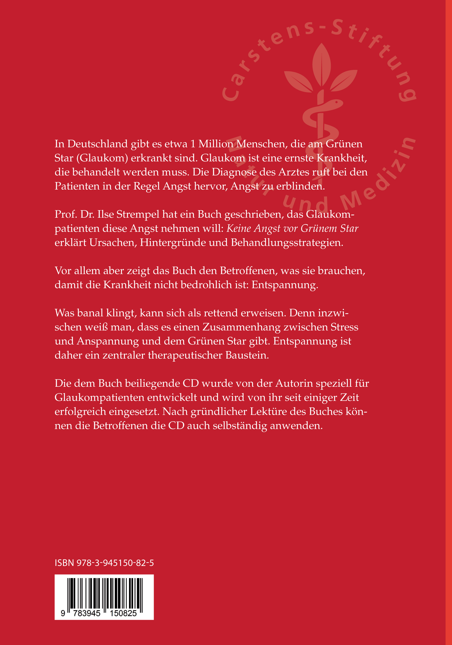 In Deutschland gibt es etwa 1 Million Menschen, die am Grünen Star (Glaukom) erkrankt sind. Glaukom ist eine ernste Krankheit, die behandelt werden muss. Die Diagnose des Arztes ruft bei den Patienten in der Regel Angst hervor, Angst zu erblinden. Prof. Dr. Ilse Strempel hat ein Buch geschrieben, das Glaukompatienten diese Angst nehmen will: Keine Angst vor Grünem Star erklärt Ursachen, Hintergründe und Behandlungsstrategien. Vor allem aber zeigt das Buch den Betroffenen, was sie brauchen, damit die Krankheit nicht bedrohlich ist: Entspannung. Was banal klingt, kann sich als rettend erweisen. Denn inzwischen weiß man, dass es einen Zusammenhang zwischen Stress und Anspannung und dem Grünen Star gibt. Entspannung ist daher ein zentraler therapeutischer Baustein. Die dem Buch beiliegende CD wurde von der Autorin speziell für Glaukompatienten entwickelt und wird von ihr seit einiger Zeit erfolgreich eingesetzt. Nach gründlicher Lektüre des Buches können die Betroffenen die CD auch selbständig anwenden.