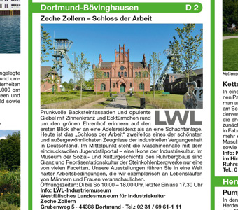 Dortmund und seine Umgebung bieten vielseitige Möglichkeiten: Ein gut ausgebautes Radwegenetz gibt dem Radler Einblicke in die vergangene Industriekultur des Ruhrgebiets und in die neu angelegten Grüngürtel. Wanderer können auf einem 110 km langen Wanderweg rund um die Stadt wandern oder auch kürzere Touren im Stadtgebiet vornehmen. Von Bergkamen bis Witten ist auf der Rückseite - alphabetisch geordnet - Wissenswertes zur Region zusammengetragen.