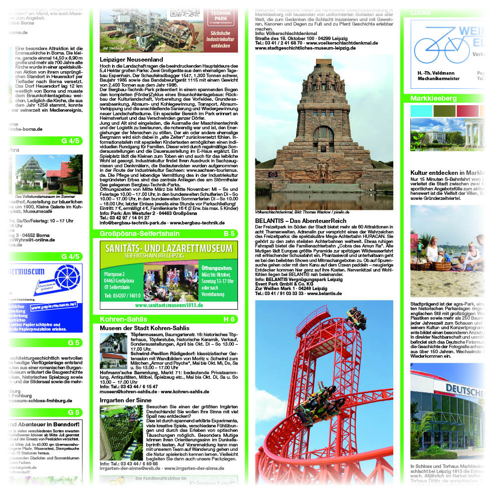 Wie aus einem ehemaligen Braunkohlerevier eine blühende Landschaft entstehen kann, zeigt eindrucksvoll die Leipziger Neuseenlandschaft. Die zweite Karte, die den südlichen Teil des Leipziger Neuseenlandes umfasst, spricht nicht nur Wassersport- und Naturfreunde unter den Radlern und Wanderen an, sondern begeistert auch kulturell mit verschiedenen interessanten Themen: Vom Turmuhrenmuseum, über historische Schlösser bis hin zum Bergbau-Technik-Park ist alles vorhanden. Und der Irrgarten der Sinne, der Leipziger Zoo oder der BELANTIS Vergnügngspark begeistern nicht nur Kinder.