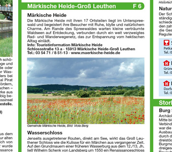 Der Naturpark Dahme und das Biosphärenreservat Spreewald garantieren Rad- und Wandererlebnisse durch eine besonders geschützte Naturlandschaft. Fernwanderwege, Fernradwege, aber auch kürzere regionale Strecken lassen die von Flüssen und Seen durchzogenen Wälder erkunden. Eine Besonderheit: das Wasserwandern, das das Kanufahren in geliehenen Booten ermöglicht. Wo sich Zwischenstopps lohnen, erfährt man auf der Kartenrückseite.