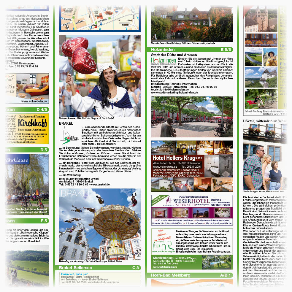 Das Kulturland Kreis Höxter bietet den Radfahrern einen interessanten Mix aus westfälischer Gemütlichkeit, Klöstern, Schlössern und Natur. Im 3-Länder-Eck zwischen Hessen, NRW und Niedersachsen gelegen, bieten sich Touren durch die Naturparks Eggegebirge und südlicher Teutoburger Wald an, ebenso entlang der Weser oder Diemel. Warburg, Höxter oder Holzminden lohnen einen Abstecher. Nähere Informationen zu den Sehenswürdigkeiten und Stadtpläne auf der Kartenrückseite erleichtern die Orientierung.