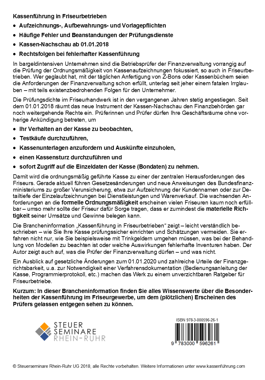 Ein Ausblick auf gesetzliche Änderungen zum 01.01.2020 und zahlreiche Urteile der Finanzgerichtsbarkeit, u.a. zur Notwendigkeit einer Verfahrensdokumentation (Bedienungsanleitung der Kasse, Programmierprotokoll, etc.) machen das Werk zu einem unverzichtbaren Ratgeber für Friseurbetriebe.