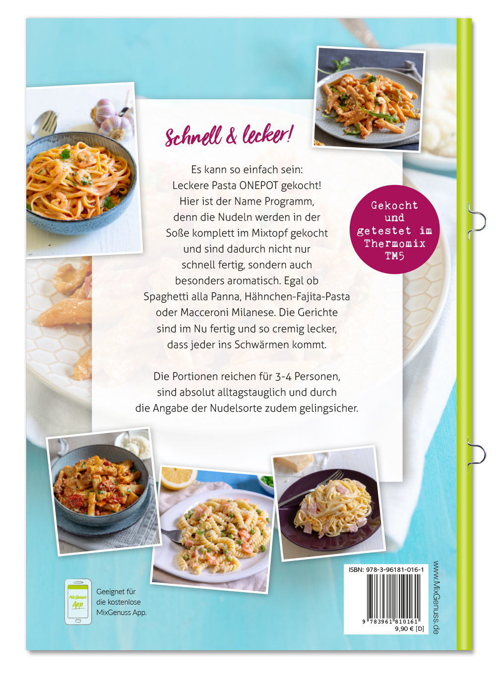 Es kann so einfach sein: Leckere Pasta ONEPOT gekocht!Hier ist der Name Programm, denn die Nudeln werden in derSoße komplett im Mixtopf gekocht und sind dadurch nicht nurschnell fertig, sondern auch besonders aromatisch.Egal ob Spaghetti alla Panna, Hähnchen-Fajita-Pasta oder Macceroni Milanese.Die Gerichte sind im Nu fertig und so cremig lecker, dass jeder ins Schwärmen kommt.Die Portionen reichen für 3-4 Personen, sind absolut alltagstauglich und durchdie Angabe der Nudelsorte zudem gelingsicher.