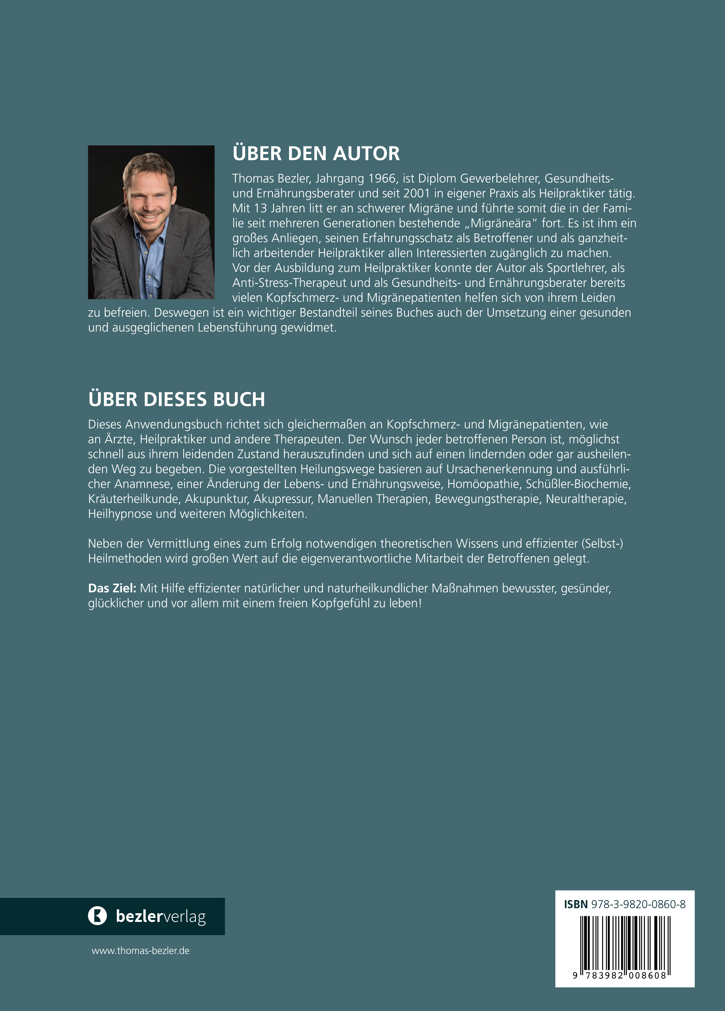Thomas Bezler, Jahrgang 1966, ist Diplom Gewerbelehrer, Gesundheits- und Ernährungsberater und seit 2001 in eigener Praxis als Heilpraktiker tätig. Mit 13 Jahren litt er an schwerer Migräne und führte somit die in der Familie seit mehreren Generationen bestehende „Migräneära“ fort. Es ist ihm ein großes Anliegen, seinen Erfahrungsschatz als Betroffener und als ganzheitlich arbeitender Heilpraktiker allen Interessierten zugänglich zu machen. Vor der Ausbildung zum Heilpraktiker konnte der Autor als Sportlehrer, als Anti-Stress-Therapeut und als Gesundheits- und Ernährungsberater bereits vielen Kopfschmerz- und Migränepatienten helfen sich von ihrem Leiden zu befreien. Deswegen ist ein wichtiger Bestandteil seines Buches auch der Umsetzung einer gesunden und ausgeglichenen Lebensführung gewidmet.