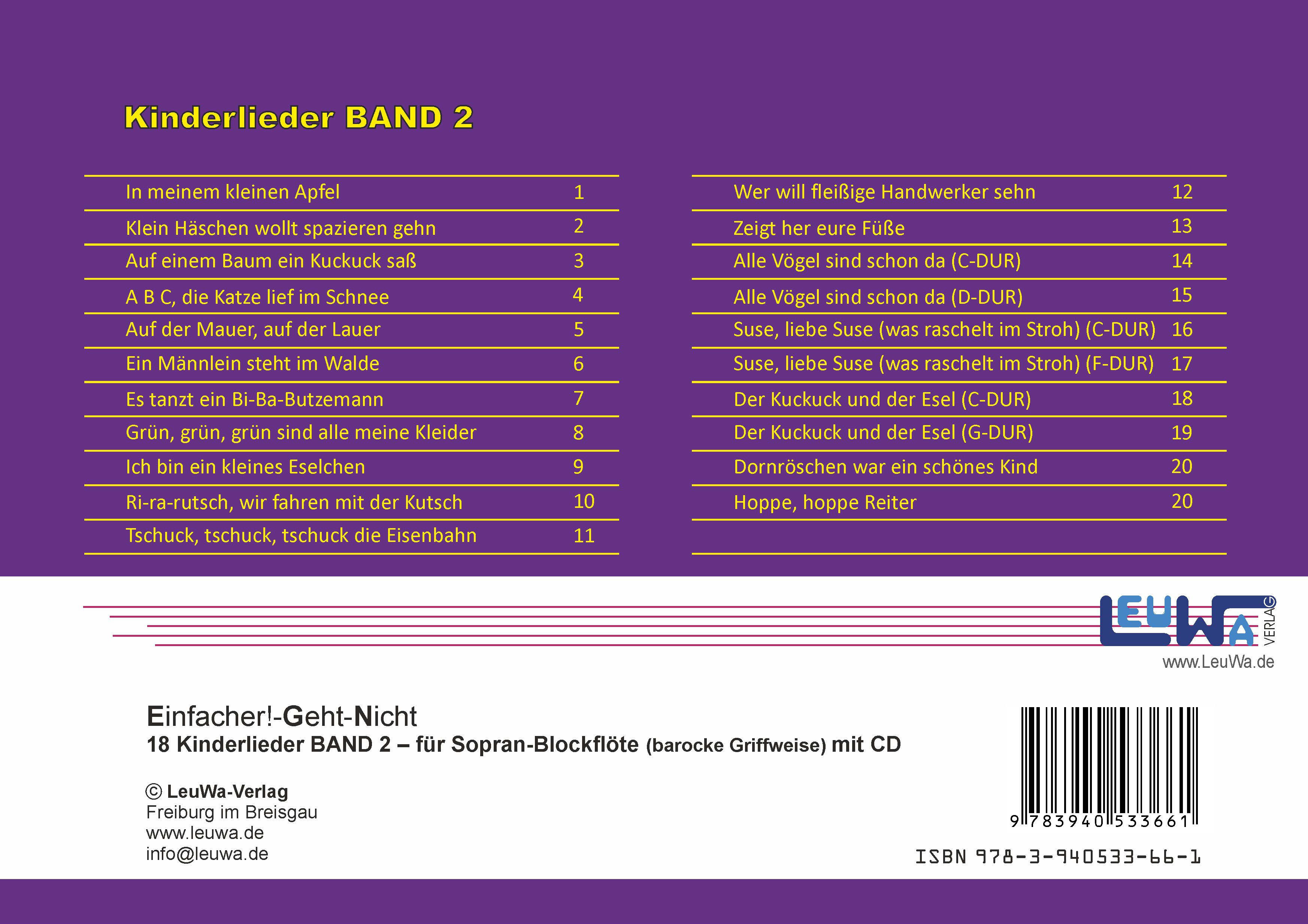 Einfacher geht es nicht: 18 Kinderlieder (Band 2) mit einzigartiger Notationsergänzung, die von Einsteigern sehr schnell auf der Blockflöte (barocke Griffweise) gespielt werden können.