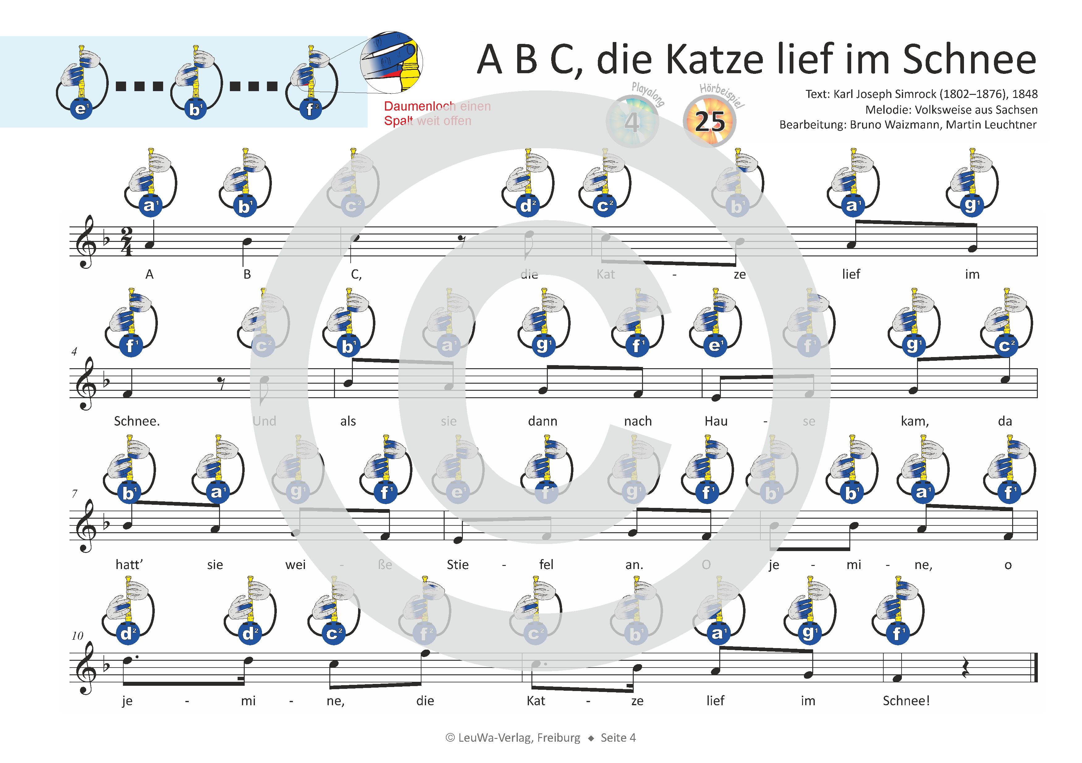 Das funktioniert ohne Notenkenntnisse, die spielerisch und ganz nebenbei gelernt werden. Es gibt über jeder Note eine Grafik. Entsprechend der markierten Finger wird der jeweilige Griff dargestellt. Durch diese Notationsergänzung können auch Anfänger sehr schnell auf der Blockflöte spielen.