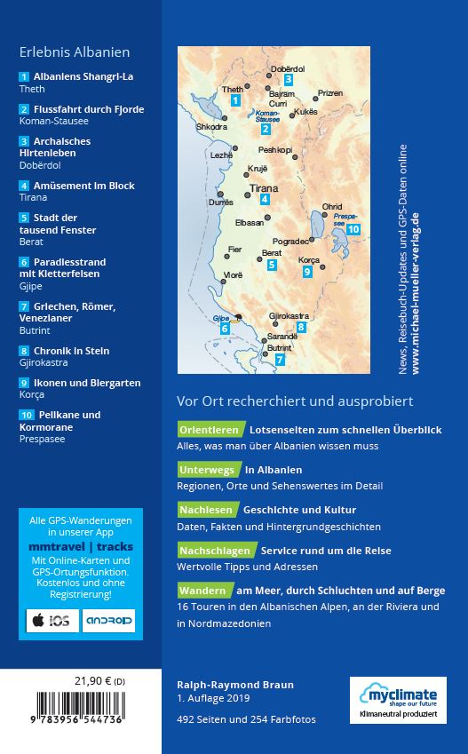 Der Albanien-Reiseführer von Ralph-Raymond Braun glänzt mit 492 prall gefüllten Seiten, 254 Farbfotos und 30 Karten plus herausnehmbarer Faltkarte im Maßstab 1:500.000. Mit mehr als 180 beschriebenen Orten, 16 Wanderungen, davon zwei in Nord-Mazedonien, samt GPS-Tracks zum kostenlosen Download und der registrierungsfreien gratis mmtravel App ist er der ideale Begleiter für Ihren Albanien-Urlaub. Vor Ort akribisch für Sie recherchiert und ausprobiert: Profitieren Sie in Ihrer schönsten Zeit des Jahres von den hilfreichen Tipps und Hinweisen des Albanien-Reiseführers. Geheimtipps des Autors sind hervorgehoben, ebenso wie ökologisch, regional und nachhaltig wirtschaftende Betriebe.