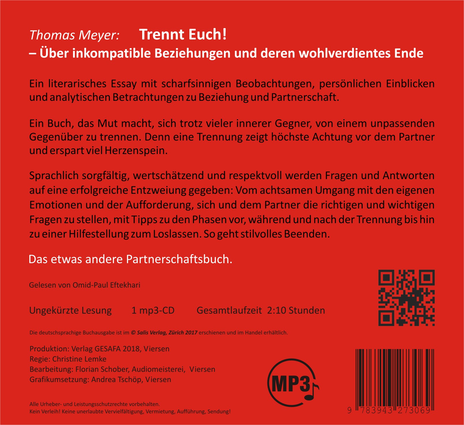 Trennt Euch! Ein literarisches Essay mit einer anderen Sicht auf Partnerschaft und Beziehung. Denn wenn es nicht passt, soll die Beziehung besser beendet werden, ist die Meinung des Autors. Denn das Leben ist sehr kurz, um in in inkompatiblen Beziehungen stecken zu bleiben.