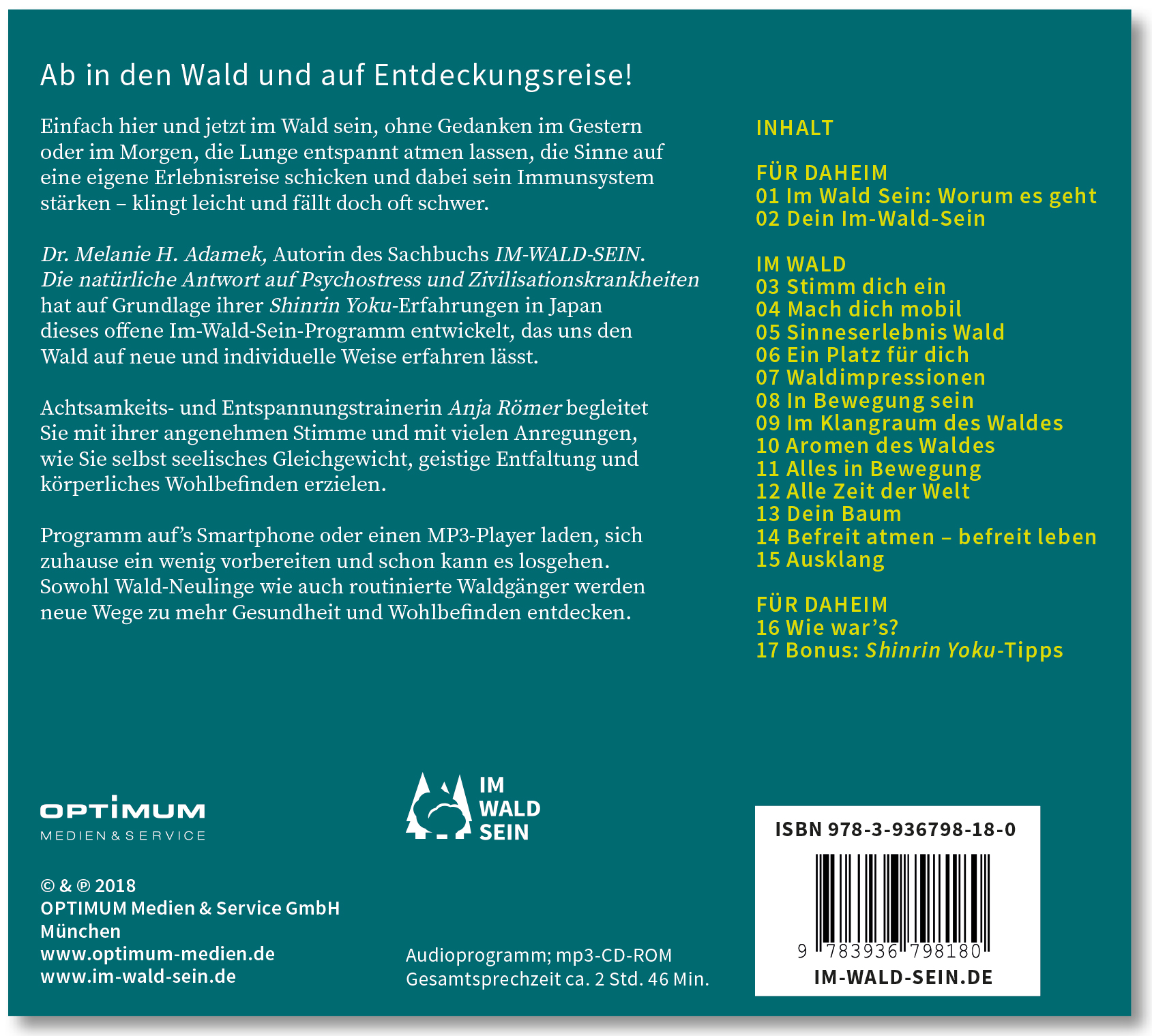 "Es gibt nichts Gutes, außer man tut es! Das gilt für unsere Gesundheit ganz besonders. Doch sehr oft fehlt die Motivation," sagt Wald-Gesundheitsexpertin Dr. Melanie H. Adamek und schafft gleich Abhilfe. Statt nur ein gutes Buch über unseren geliebten Wald zu lesen, was natürlich auch gut ist, gehen wir den nächsten Schritt, und zwar schnurstracks in den Wald. Die renommierte Buchautorin schuf das weltweit einzigartige Konzept eines Audioguides für den Wald. Ein (ent)spannendes Wald-Gesundheits-Training, das unmittelbar auf den Forschungsergebnissen des Shinrin Yoku beruht.