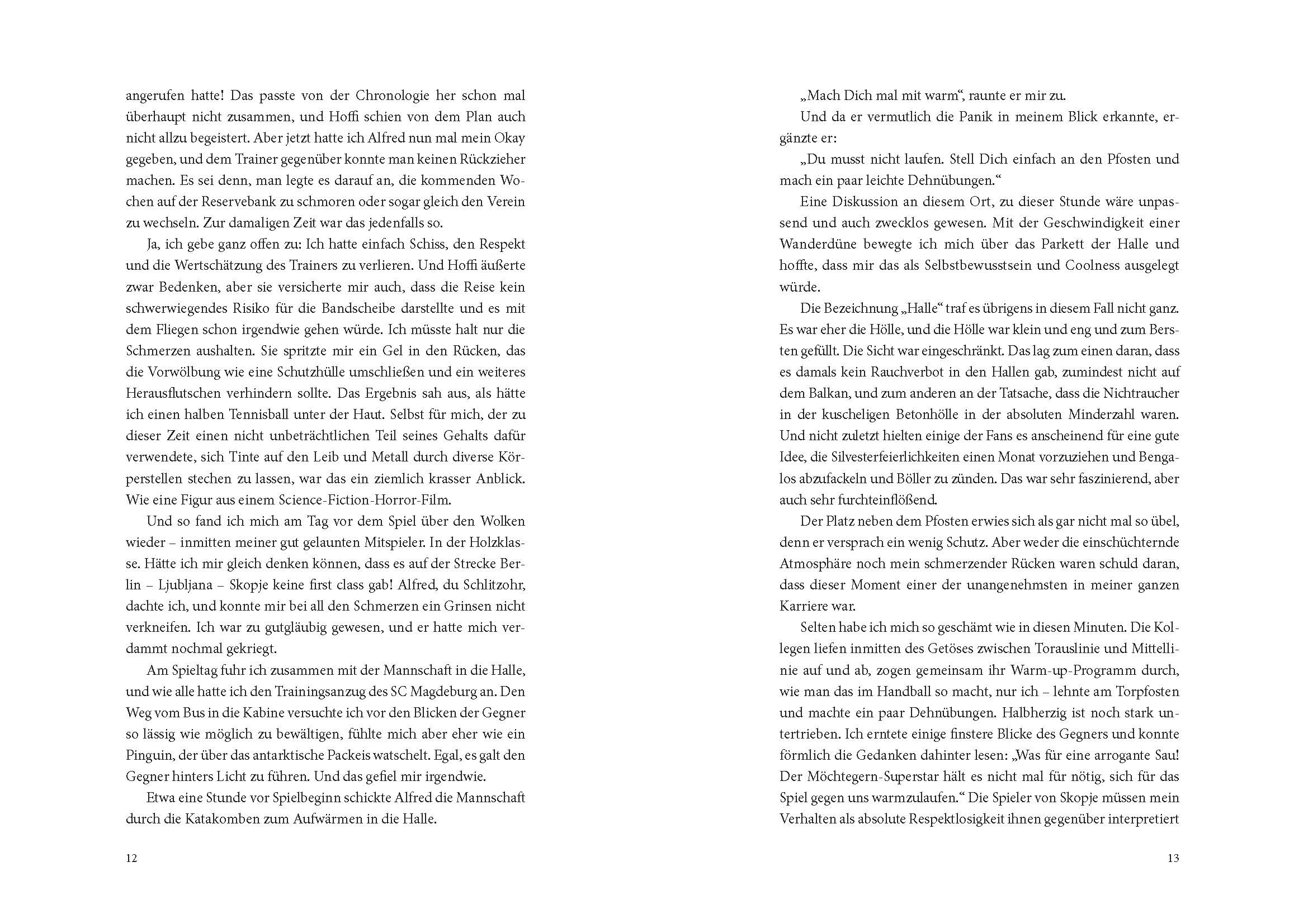 Der Leser erfährt, warum die entnervten Nachbarn in der elterlichen Berliner Plattenbauwohnung Schuld am Start Stefan Kretzschmars Handballkarriere waren, wie Alfred Gislason es schaffte, ihn trotz Bandscheibenverletzung bei einem Champions-League-Spiel auflaufen zu lassen, oder warum Brustwarzendrehen das Foul für „fortgeschrittene Dreckssäcke“ ist.