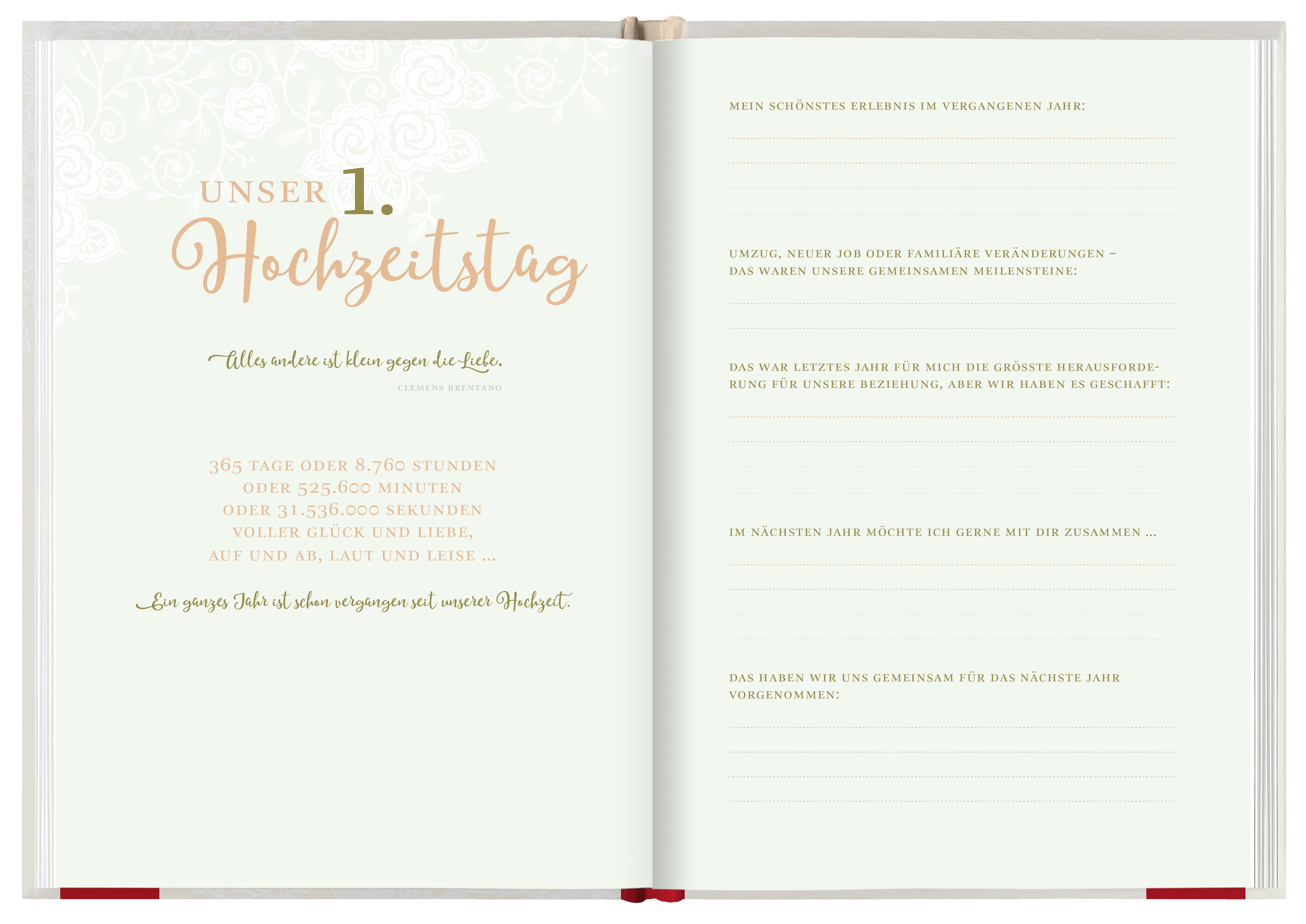 - 128-seitiges Eintragbuch, das Paare vom 1. bis zum 50. Hochzeitstag begleitet