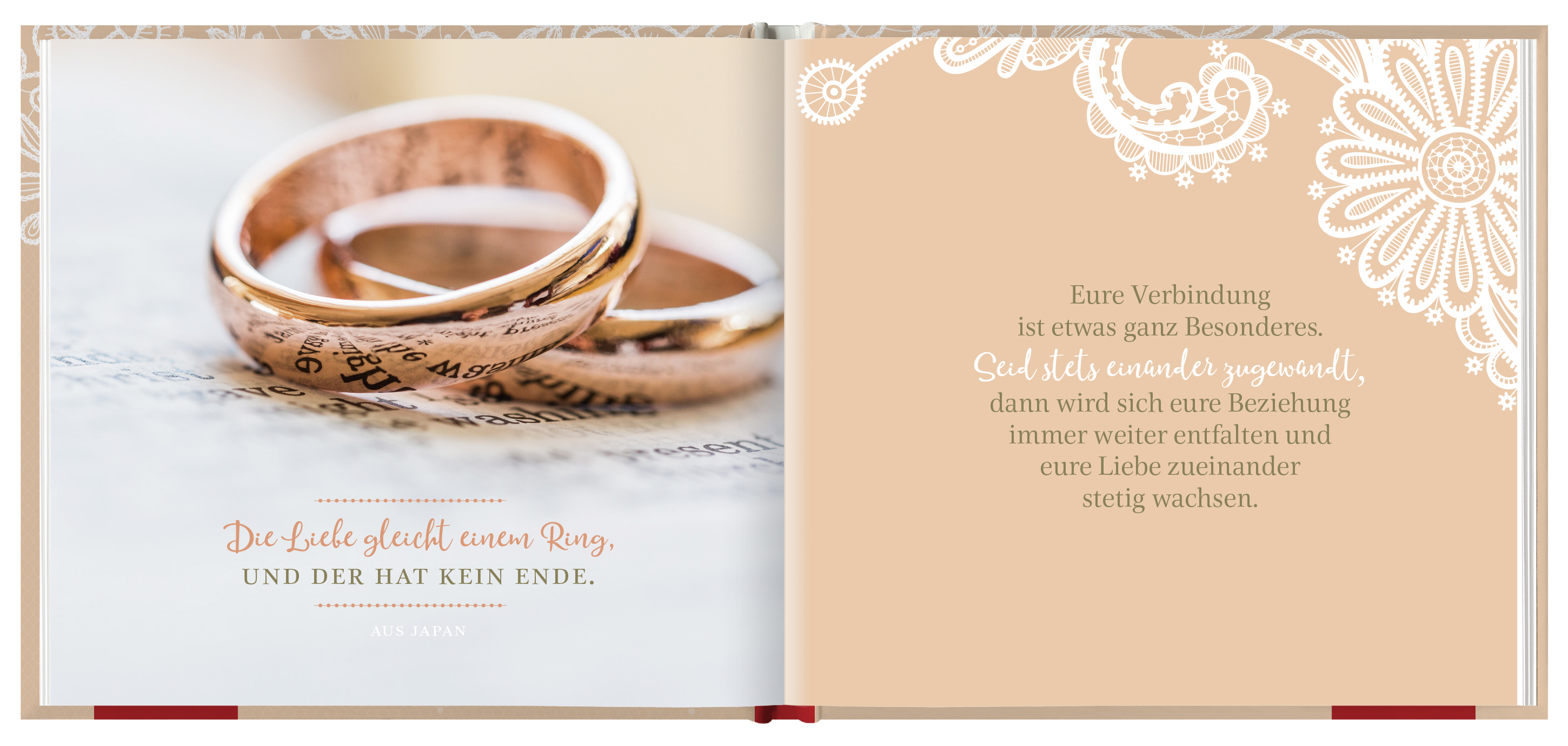 Die Spitzen-Optik macht das Buch zu einem echten Hingucker. Auch im Inneren ist es liebevoll und edel gestaltet. Ob als kleines Geschenk für die frischvermählte Kollegin oder als Zugabe zu einem größeren Geschenk für ein befreundetes Brautpaar, hier verschenken Sie tolle Texte in liebevoller Gestaltung.