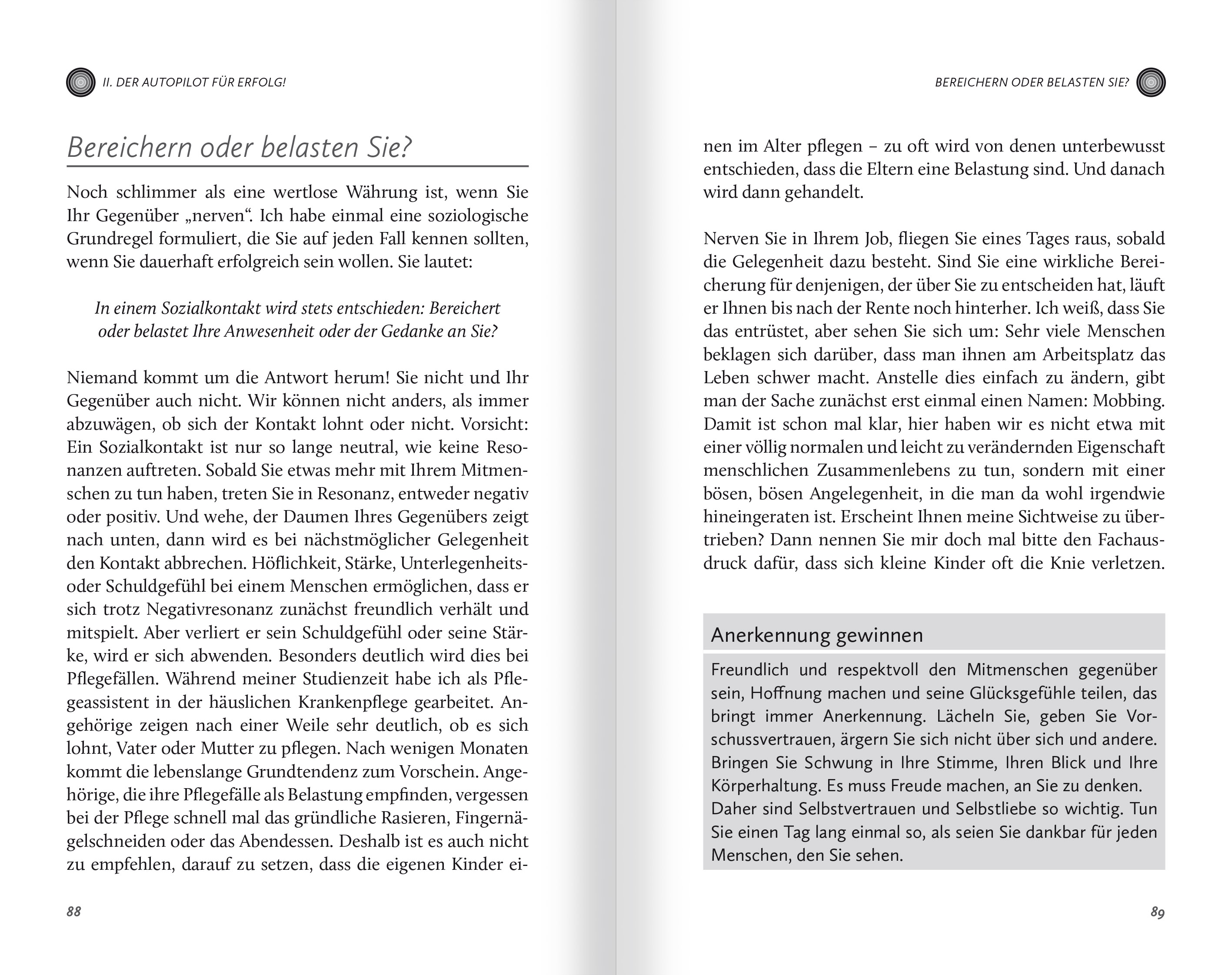 ((Auszug aus dem Kapitel "II. Der Autopilot für Erfolg"))EIN ZIEL IST EIN ZIEL IST EIN ZIEL"Der Weg ist das Ziel" lautet eine oft missverstandene, tiefgründige buddhistische Weisheit. Ich möchte im Zusammenhang mit Erfolgscoaching hier lieber dabei bleiben, dass ein Weg ein Weg und ein Ziel ein Ziel ist. Dieses ist erst dann erreicht, wenn der Gang dorthin abgeschlossen ist und der Weg hinter einem liegt. Natürlich kann man auch einen Weg mit Genuss gehen, dann ist aber dieser Genuss in dem Augenblick das Ziel. Wenn Sie sich nämlich um den Weg kümmern, tappen Sie in eine Falle: Sie beschränken Ihre Möglichkeiten zur Zielerreichung, vergeuden Zeit und schaffen Frustrationen.Denken Sie noch einmal an das Beispiel mit dem Kind, das Laufen lernt. Einfacher als das bewusste Koordinieren von Muskeln zum Halten des Gleichgewichts ist es allemal, die Mama vor sich stehen zu sehen und zu beschließen: "Da will ich hin, egal wie!" Das Ziel war also nicht, die Balance zu halten und zu laufen, sondern Mama zu erreichen. Freihändiges Gehen war nur der Nebeneffekt.Was ist also genau Ihr Ziel? Wollen Sie beispielsweise mehr Geld verdienen? Wie viel genau? Bis wann? Wozu genau? Ist es wirklich Geld (glaube ich nicht!!!)? Sie denken, Sie wollen reich werden. Also warum? Weil Sie sich dann alles leisten können. Warum ist Ihnen das so wichtig? Weil Sie als Kind immer verzichten mussten? Wer hat Ihnen uneingeschränkte Möglichkeiten versprochen? Ach, die Eltern konnten sich alles kaufen, haben Ihnen aber nicht alles geschenkt. Wollen Sie Unabhängigkeit von Ihren Eltern? Brauchen Sie dafür wirklich ein Vermögen, oder reicht es aus, innerlich erwachsen zu werden, damit Sie unabhängig entscheiden und sich verwirklichen können? Na bitte!Die Frage "Was wollen Sie wirklich und warum?" sollte Ihnen bei allem, was Sie tun, wie ein Echo durch den Kopf hallen. (...) Sie wollen schlank werden? Wozu? Anerkennung? Warum ist Ihnen das so wichtig? Weil Sie als Kind nicht aufgefallen sind und zu wenig davon bekommen haben? Mit Ihrem Übergewicht fallen Sie auf. Wie erreichen Sie positive Anerkennung, selbst wenn Sie nicht abnehmen? Sobald Sie das erreicht haben, werden Sie schlank. (...)Analysieren Sie es mit den vorgenannten Fragen so lange, bis Sie Ihre Etappenziele erkannt und sich Ihr Endziel bewusst gemacht haben. Mit genau diesem Endziel "füttern" Sie Ihren "Zielcomputer". Sie brauchen sich nur genau vorzustellen, wann Sie dieses Ziel wohl realistischerweise erreicht haben, und vor allem: wie sich das anfühlt, wenn es erreicht ist. Die Frage "Wozu ist mein Ziel gut?" ist die naheliegendste und doch die am schwierigsten zu beantwortende, aber auch die wichtigste. Mit ihr beginnt der Weg. Doch mittels dieser Analyse müsste es klappen.Wir können unsere Ziele stets und ständig ändern, korrigieren, fallen lassen und neu justieren, aber ein Ziel definiert sich dadurch, dass es der Endpunkt einer Reise ist und sich nach seinem Erreichen kein Weg mehr mit demselben Ziel anschließt. Ein Verhaltensabschnitt wird durch das Erreichen eines Ziels beendet und entfaltet damit seinen erlösenden Charakter. Sie schießen mit dem Pfeil so lange auf eine Zielscheibe, bis Sie den Mittelpunkt getroffen haben. Haben Sie ihn getroffen, kann Ihr neues Ziel nun die Wiederholung des Ergebnisses sein. Doch um dieses neue Ziel zu erreichen, muss das alte zunächst erreicht oder aufgegeben worden sein.Bleiben Sie niemals auf Ihrem Weg. Kümmern Sie sich am besten gar nicht darum, wie Sie ein Ziel erreichen. Sie lassen, bildlich gesprochen, eine gebrochene Hand am besten dadurch heilen, dass Sie sich damit abfinden, mit der anderen Hand zu arbeiten. Das ist es, was ich mit "loslassen" meine. Versteifen Sie sich darauf, die Hindernisse auf dem Weg zum Ziel wegzuräumen, bleiben Sie ewig auf dem Weg mit seinen Hindernissen. Ist Ihnen das Endziel nicht bekannt oder nicht wichtig, ebenso. Und das bringt uns geradewegs zu den Prioritäten. (...)
