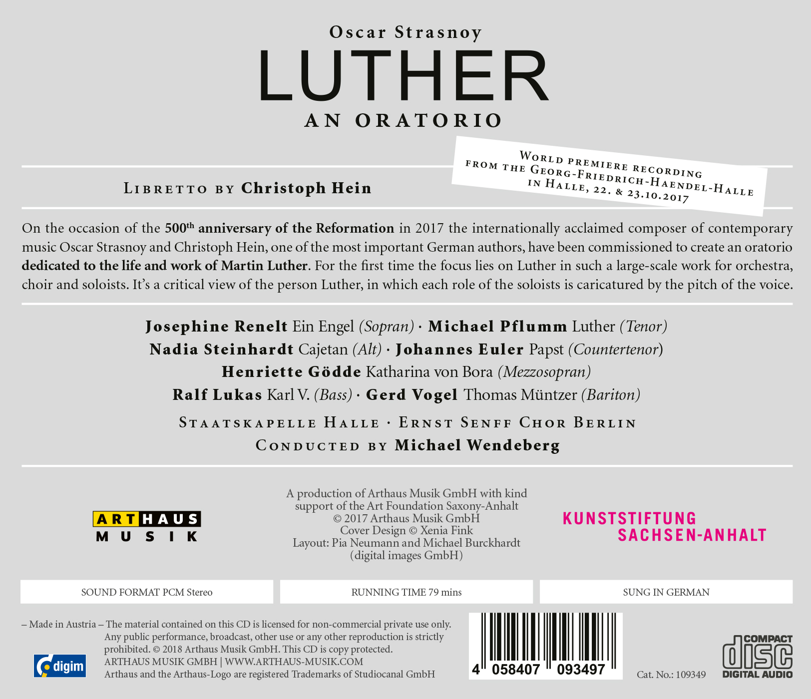 On the occasion of the 500th anniversary of the Reformation in 2017 the internationally acclaimed composer of contemporary music Oscar Strasnoy and Christoph Hein, one of the most important German authors, have been commissioned to create an oratorio dedicated to the life and work of Martin Luther. For the first time the focus lies on Luther in such a large-scale work for orchestra, choir and soloists. It's a critical view of the person Luther, in which each role of the soloists is caricatured by the pitch of the voice.