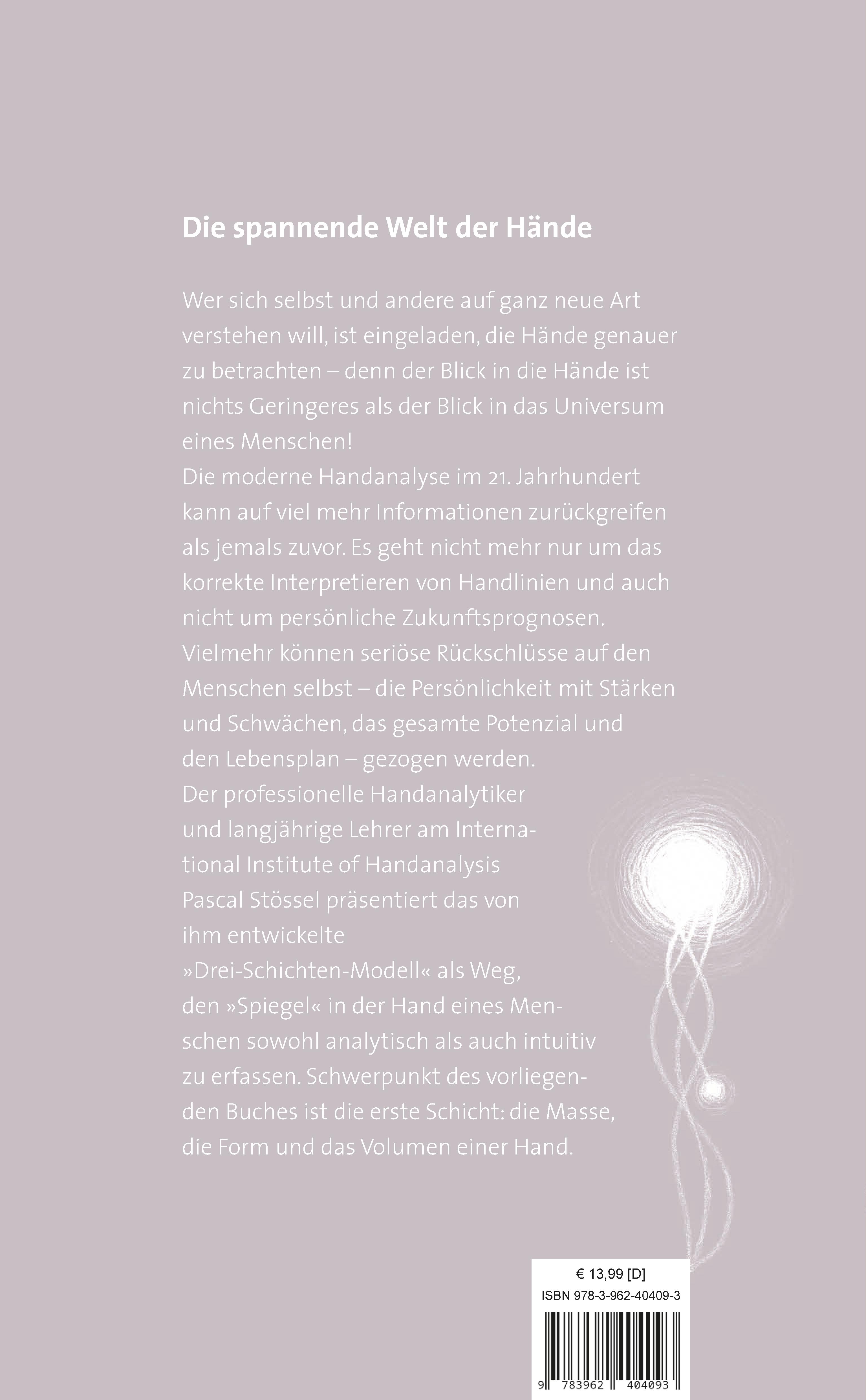 Wer sich selbst und andere auf ganz neue Art verstehen will, ist eingeladen, die Hände genauer zu betrachten - denn der Blick in die Hände ist nichts Geringeres als der Blick in das Universum eines Menschen!Die moderne Handanalyse im 21. Jahrhundert kann auf viel mehr Informationen zurückgreifenals jemals zuvor. Es geht nicht mehr nur um das korrekte Interpretieren von Handlinien und auch nicht um persönliche Zukunftsprognosen. Vielmehr können seriöse Rückschlüsse auf denMenschen selbst - die Persönlichkeit mit Stärken und Schwächen, das gesamte Potenzial undden Lebensplan - gezogen werden.Der professionelle Handanalytiker und langjährige Lehrer am International Institute of Handanalysis Pascal Stössel präsentiert das von ihm entwickelte »Drei-Schichten-Modell« als Weg,den »Spiegel« in der Hand eines Menschen sowohl analytisch als auch intuitiv zu erfassen. Schwerpunkt des vorliegenden Buches ist die erste Schicht: die Masse, die Form und das Volumen einer Hand.
