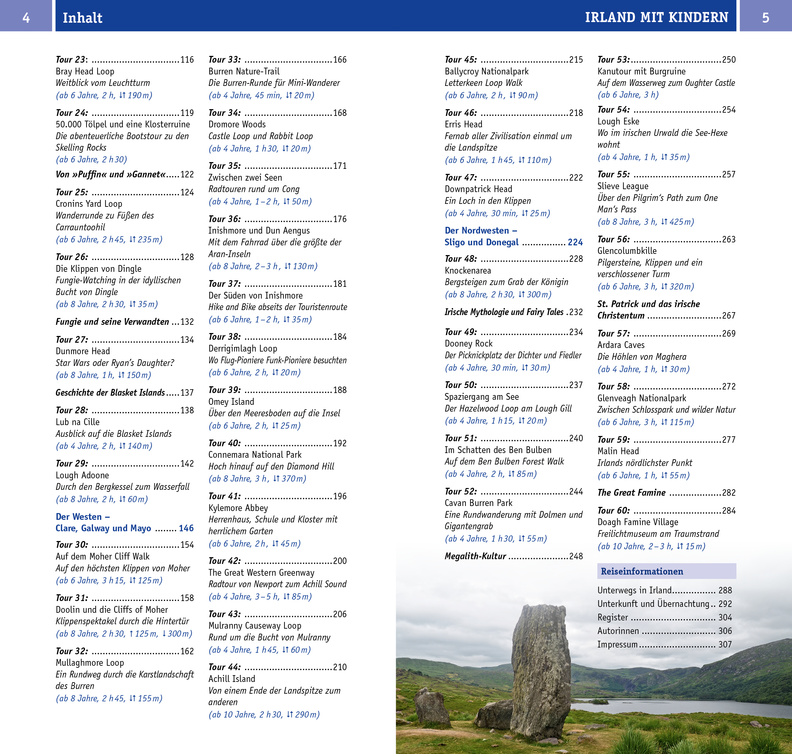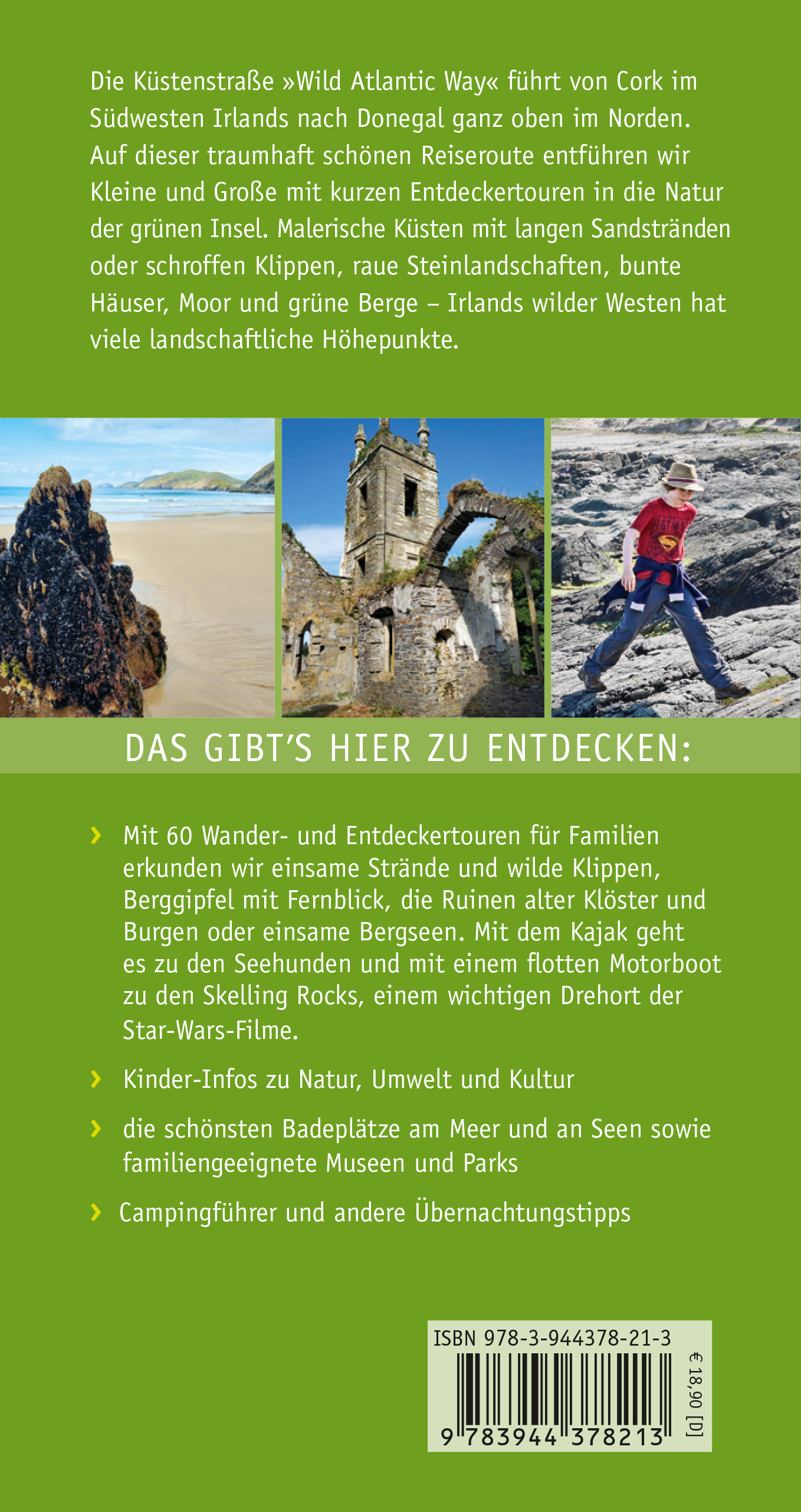 Die Küstenstraße »Wild Atlantic Way« führt von Cork im Südwesten Irlands nach Donegal ganz oben im Norden. Auf dieser traumhaft schönen Reiseroute entführen wir Kleine und Große mit kurzen Entdeckertouren in die Natur der grünen Insel. Malerische Küsten mit langen Sandstränden oder schroffen Klippen, raue Steinlandschaften, bunte Häuser, Moor und grüne Berge - Irlands wilder Westen hat viele landschaftliche Höhepunkte.Das gibt's hier zu entdecken:' Wir erkunden einsame Strände und wilde Klippen, Berggipfel mit Fernblick, die Ruinen alter Klöster und Burgen oder einsame Bergseen. Mit dem Kajak geht es zu den Seehunden und mit einem flotten Motorboot zu den Skelling Rocks, einem wichtigen Drehort der Star Wars Filme.' Kinder-Infos zu Natur, Umwelt und Kultur' die schönsten Badeplätze am Meer und an Seen sowie familiengeeignete Museen und Parks' Campingführer und andere Übernachtungstipps