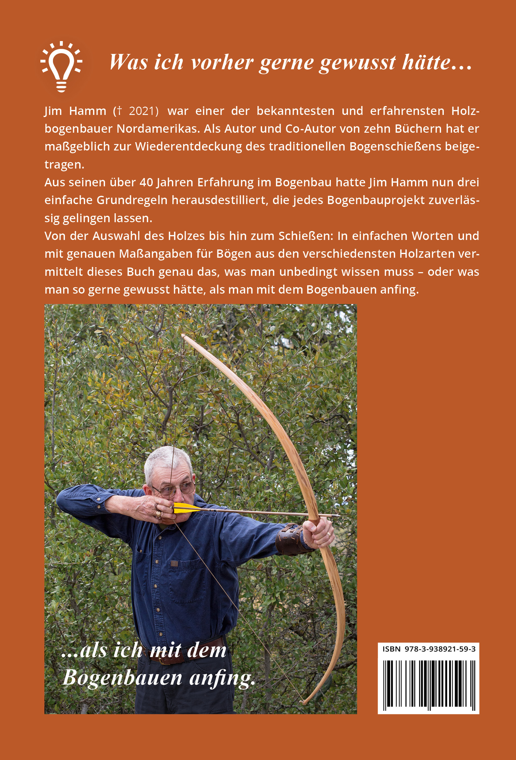 Worauf es beim Bogenbau wirklich ankommt. Die Quintessenz des Wissens, wie man aus einem Stück Holz einen leistungsstarken und dauerhaften Bogen macht.Jim Hamm ist einer der bekanntesten und erfahrensten Holzbogenbauer Nordamerikas. Als Autor und Co-Autor von zehn Büchern hat er maßgeblich zur Wiederentdeckung des traditionellen Bogenschießens beigetragen. Aus seinen über 40 Jahren Erfahrung im Bogenbau hat Jim Hamm nun drei einfache Grundregeln herausdestilliert, die jedes Bogenbauprojekt zuverlässig gelingen lassen.Von der Auswahl des Holzes bis hin zum Schießen: In einfachen Worten und mit konkreten Maßangaben für Bögen aus den verschiedensten Holzarten vermittelt dieses Buch genau das, was man unbedingt wissen muss - oder was man so gerne gewusst hätte, als man mit dem Bogenbauen anfing.
