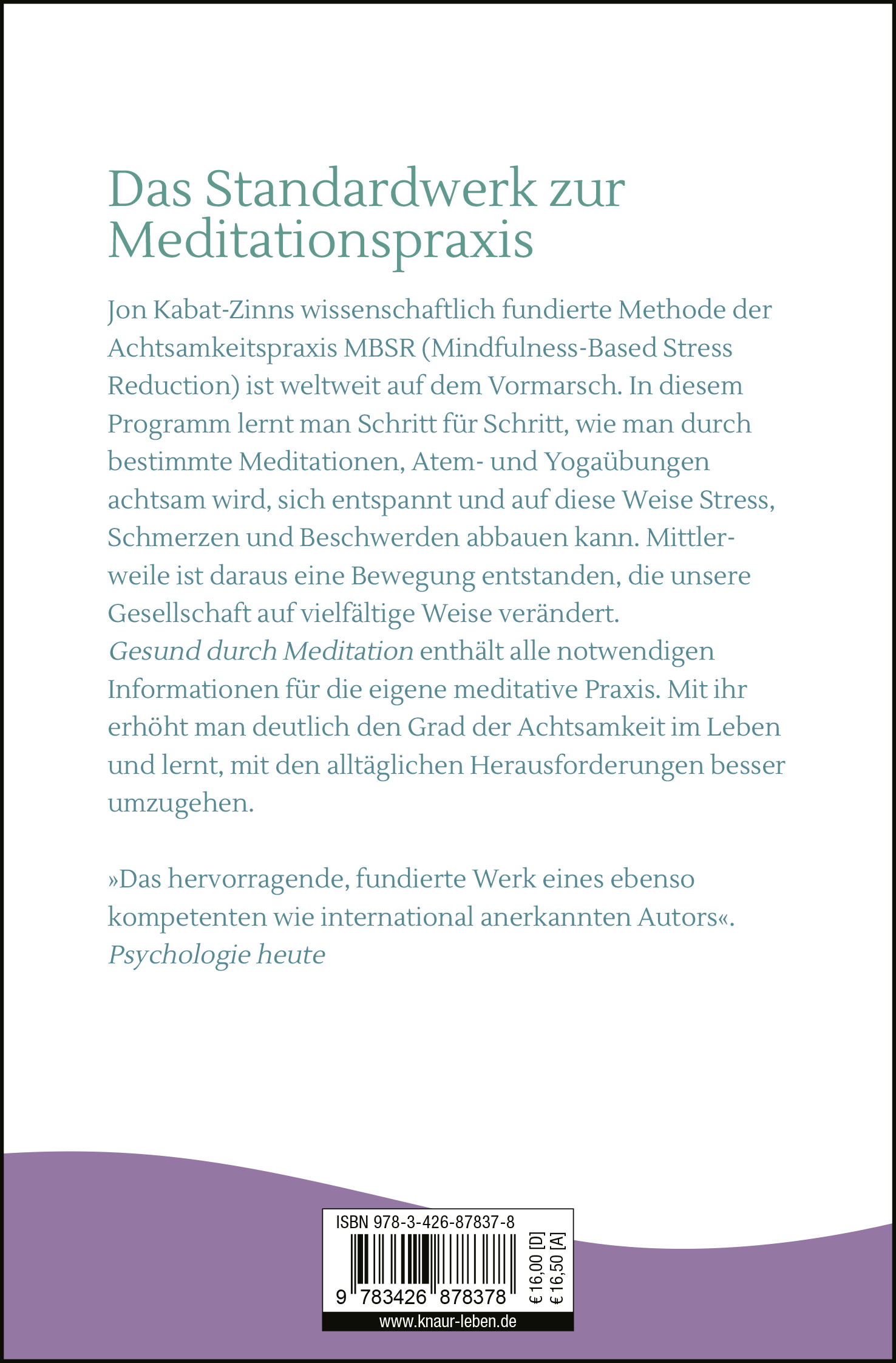 Wie hilfreich eine solche Praxis gerade in herausfordernden Zeiten sein kann, wird nirgendwo so deutlich, wie in diesem Grundlagenbuch. "Gesund durch Meditation" ist zu einem der erfolgreichsten Bücher für das sukzessive Erlangen von Gelassenheit, Präsenz und nachhaltiger Gesundheit geworden. Chronisch kranke Menschen und Schmerzpatienten finden hier hilfreiche Hinweise für einen entspannten Umgang mit ihren Beschwerden. Das Phänomen Stress wird anschaulich erläutert und nachhaltige Maßnahmen für eine veränderte innere Haltung und Einstellung zum Leben angeboten.